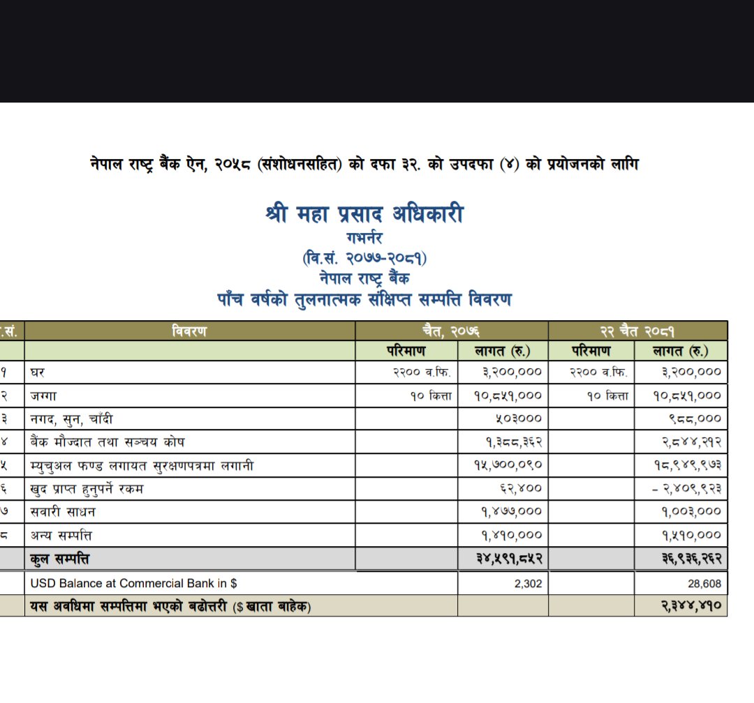 नेपाल राष्ट्र बैंकले पूर्वगभर्नर महाप्रसाद अधिकारीको सम्पत्ति सार्वजनिक गरेको हो। उनको गभर्नर पद शुक्रबार सकिएको थियो।