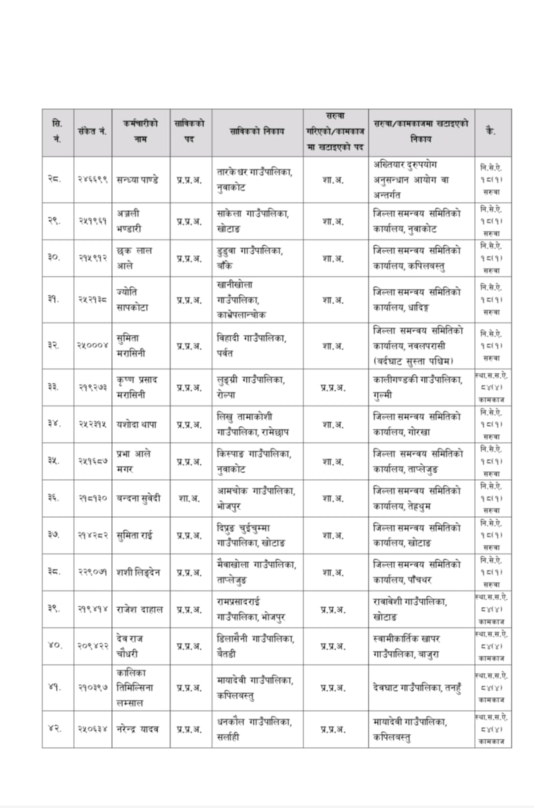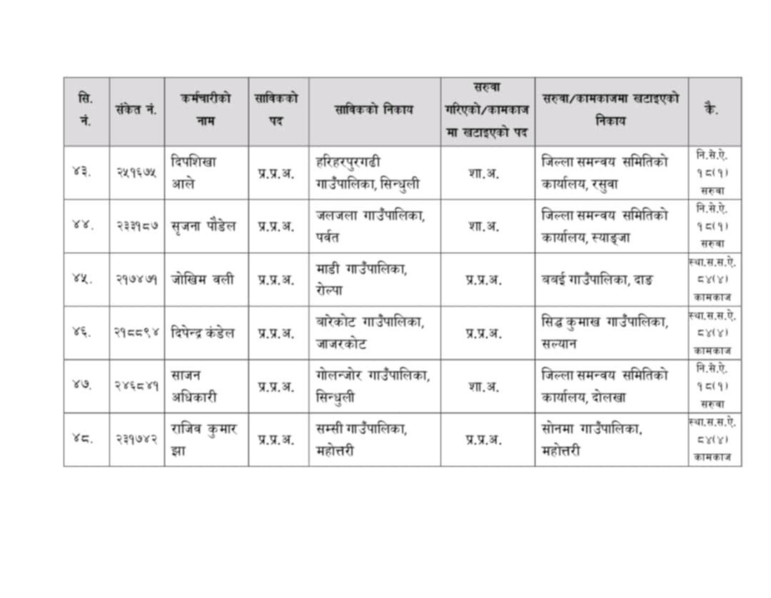 यसरी फिर्ता पठाइएका अधिकृतहरुलाई जलजला गाउँपालिकाबाट सृजना पौडेल,तारकेश्वर गाउँपालिकाबाट सन्ध्या पाण्डे,साकेला गाउँपालिका खोटाङ्गबाट अञ्जली भण्डारी,खानीखोला गाउँपालिकाबाट ज्योती देवकोटा,विदाही गाउँपालिकाबाट सुमिता मरासिनी,लिखु गाउँपालिकाबाट यशोदा थापा,किस्पाङ्गबाट प्रभा आले,आमचोकबाट बन्दना सुवेदी,दिप्रुङ्ग चुइचुम्माबाट सुमिता राई,मौवाखालाबाट शशी लिङ्गदेन,मायादेवी कपिलवस्तुबाट कालिका तिमिल्सिना लम्साल,हरिहरपुरगढीबाट दिपशिखा आले,जलजलाबाट सृजना पौडेल लगायत रहेका छन् ।