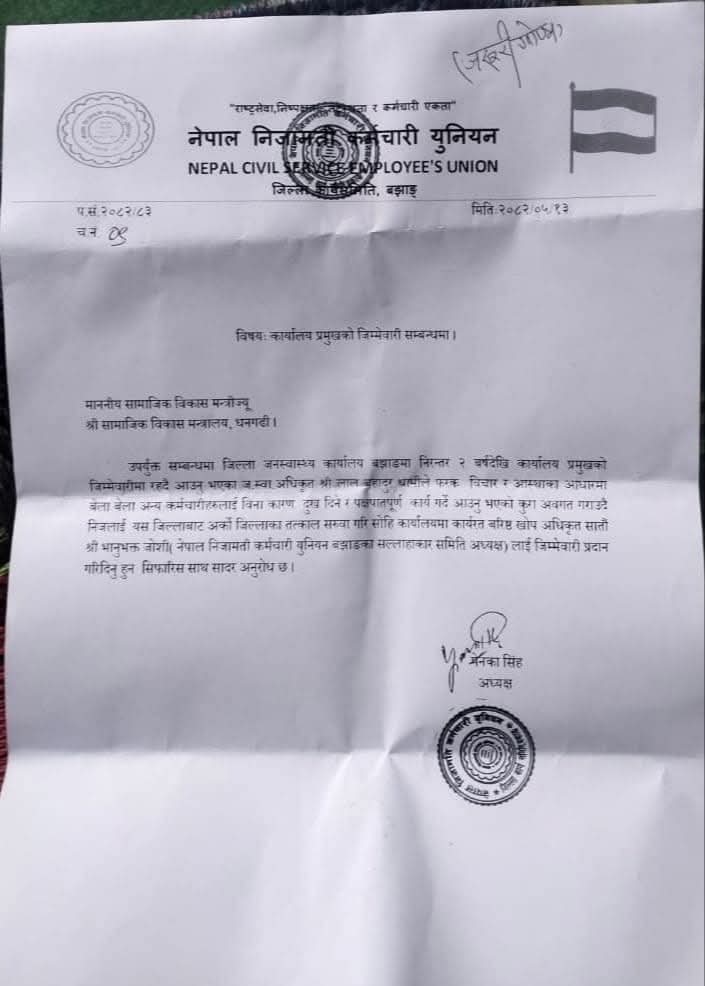 कर्मचारीतन्त्रलाई दलगत प्रभावमा पार्दै योग्यता र क्षमताभन्दा नजिकको सम्बन्ध र राजनीतिक आस्थालाई प्राथमिकता दिने प्रवृत्ति फेरि एकपटक सतहमा आएको छ । बझाङ जिल्लाको जनस्वास्थ्य कार्यालयमा कार्यरत वरिष्ठ जनस्वास्थ्य अधिकृत लालबहादुर धामी लाई हटाई युनियन निकट कर्मचारीलाई कार्यालय प्रमुख बनाइदिन सिफारिस गरिएको पत्र सार्वजनिक भएपछि चर्को आलोचना भएको छ ।