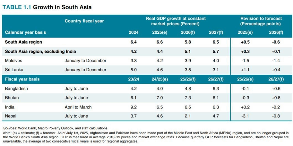 विश्व वैकले सन् २०२७ मा भने आर्थिक वृद्धि फेरि उक्लिएर ४ दशमलव ७ प्रतिशत हुने अपेक्षा गरिएको छ।विश्व बैंकको अनुमानअनुसार दक्षिण एशियाको आर्थिक वृद्धिदर यसवर्ष ६ दशमलव ६ प्रतिशत हुनेछ । सन् २०२६ मा भारतको आर्थिक वृद्धिदर ६ दशमलव ५ प्रतिशत, भुटानको ७ दशमलव ३ प्रतिशत, बंगलादेशको ४ दशमलव ८ प्रतिशत, श्रीलंकाको ३ दशमलव ५ प्रतिशत र माल्दिभ्सको ३ दशमलव ९ प्रतिशत हुने प्रक्षेपण गरिएको छ।