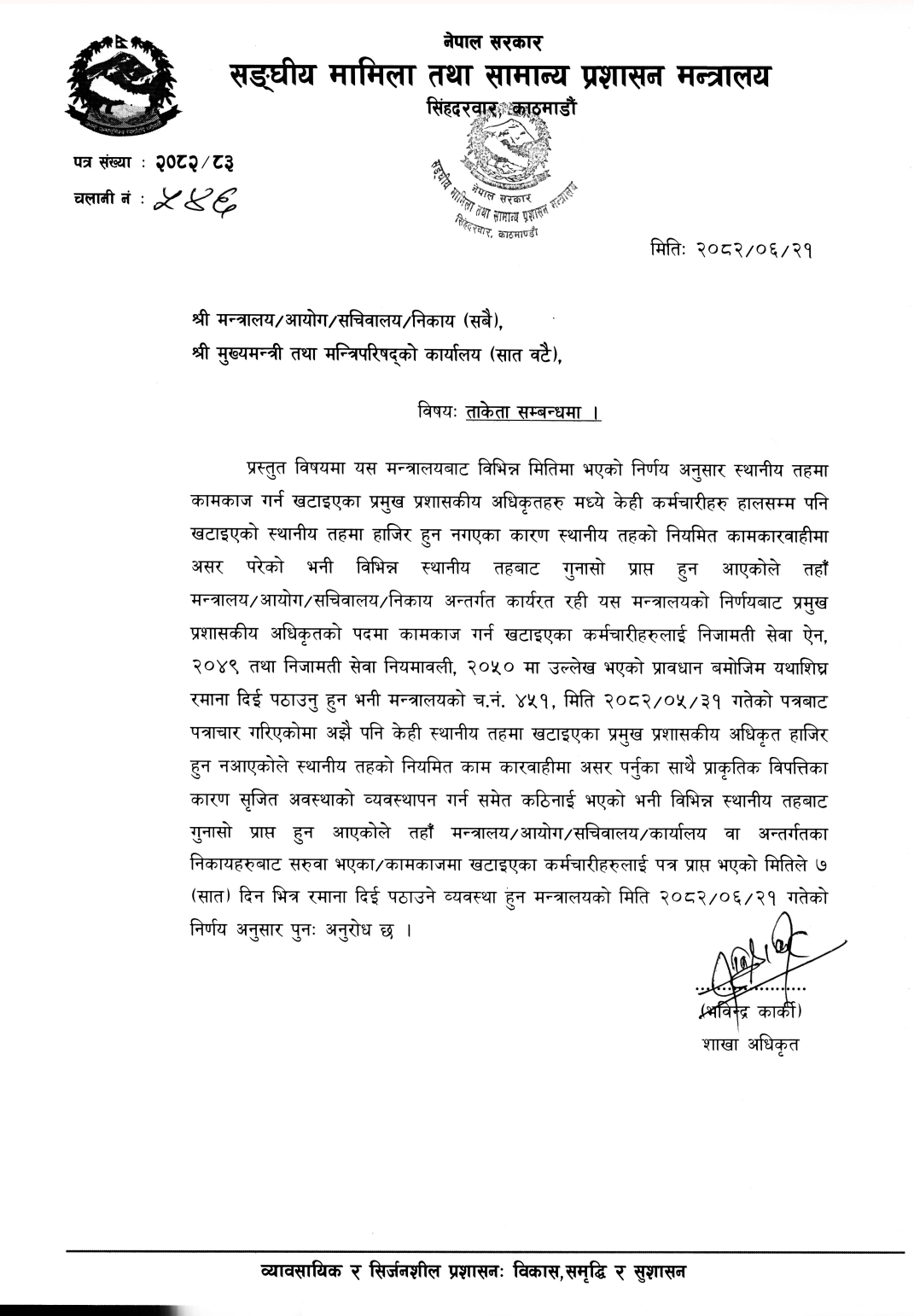 मन्त्रालयले मिति २०८२ असोज २१ गते जारी गरेको ताकेता पत्रमा भनिएको छ— “स्थानीय तहमा खटाइएका केही कर्मचारी हालसम्म समेत हाजिर नभएकाले स्थानीय तहको नियमित कामकाज प्रभावित भएको र यसले प्रशासनिक कार्यसम्पादनमा गम्भीर असर पारेको” भन्ने गुनासो मन्त्रालयमा प्राप्त भइरहेको छ।