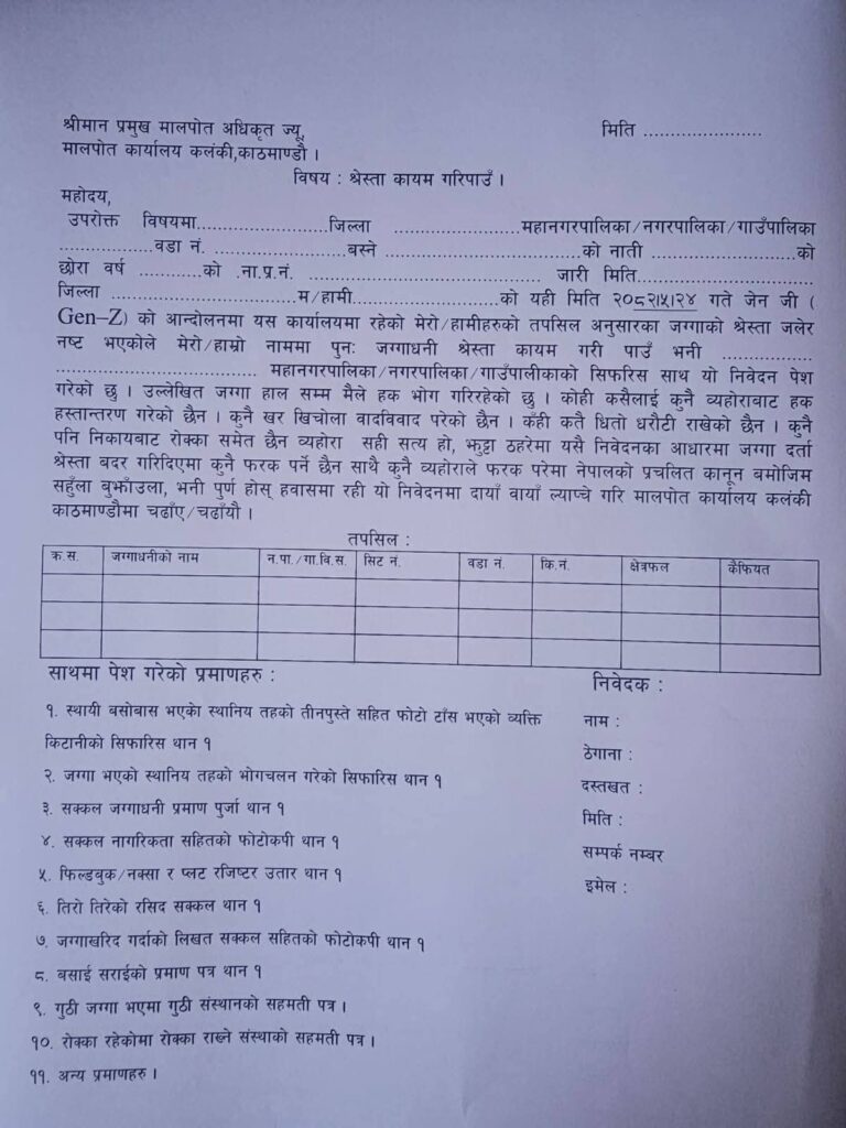 कार्यालयले नागरिकता प्रमाणपत्रको प्रतिलिपि,जग्गा रहेको स्थानीय तहबाट भएको भोग सम्बन्धी र सम्बन्धित जग्गाधनी एकिन गर्ने स्थायी ठेगाना भएको स्थानीय तहको तीन पुस्ते फोटो टाँस सहितको सिफारिस, जग्गाधनीसँग भएको सक्कल पुर्जा, जग्गाप्राप्तीको श्रोतमा लिखितबाट प्राप्त भएकोमा सक्कल लिखत, निर्णय मिसिलबाट प्राप्त भएकोमा सोको प्रमाणित प्रति प्लट रजिष्ट्रर, फिल्डबुक, नक्सा,चालु आवको मालपोत बुझाएको रसिद,जग्गा रोक्का रहेकोमा रोक्का राख्ने संस्थाको सहमति, आवश्यकता अनुसार स्थलगत सर्जमिन,आवश्यकता अनुसार ३५ दिने सार्वजनिक सूचना,गुठी जग्गाको हकमा गुठी संस्थानको सहमति पत्र र अन्य १० प्रकारको प्रमाणहरु पेश गर्न सूचना जारी गरेको छ ।