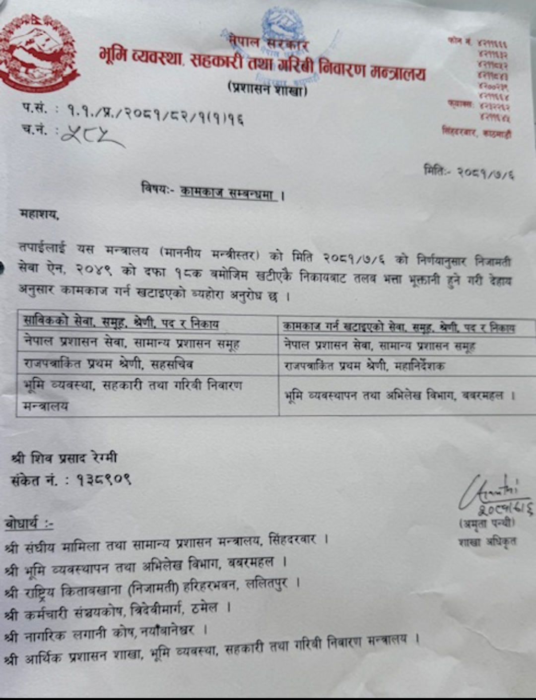 काठमाडौँ । तीन महिनाको काजमा खटाइएका महानिर्देशक शिवप्रसाद रेग्मी विभागमा प्रवेश गरेको तीन हप्ता नबित्दै सरुवा उद्योग सञ्चालन गरेको खुलासा भएको छ। संघीय मन्त्रालयले मिति २०८१ साल असोज ६ गते कामकाजका लागि मात्रै खटाएका रेग्मी पदस्थापन नहुँदै मनोमानी शैलीमा ५८ जना कर्मचारीहरूको सरुवा गरेको प्रमाण सार्वजनिक भएको छ।