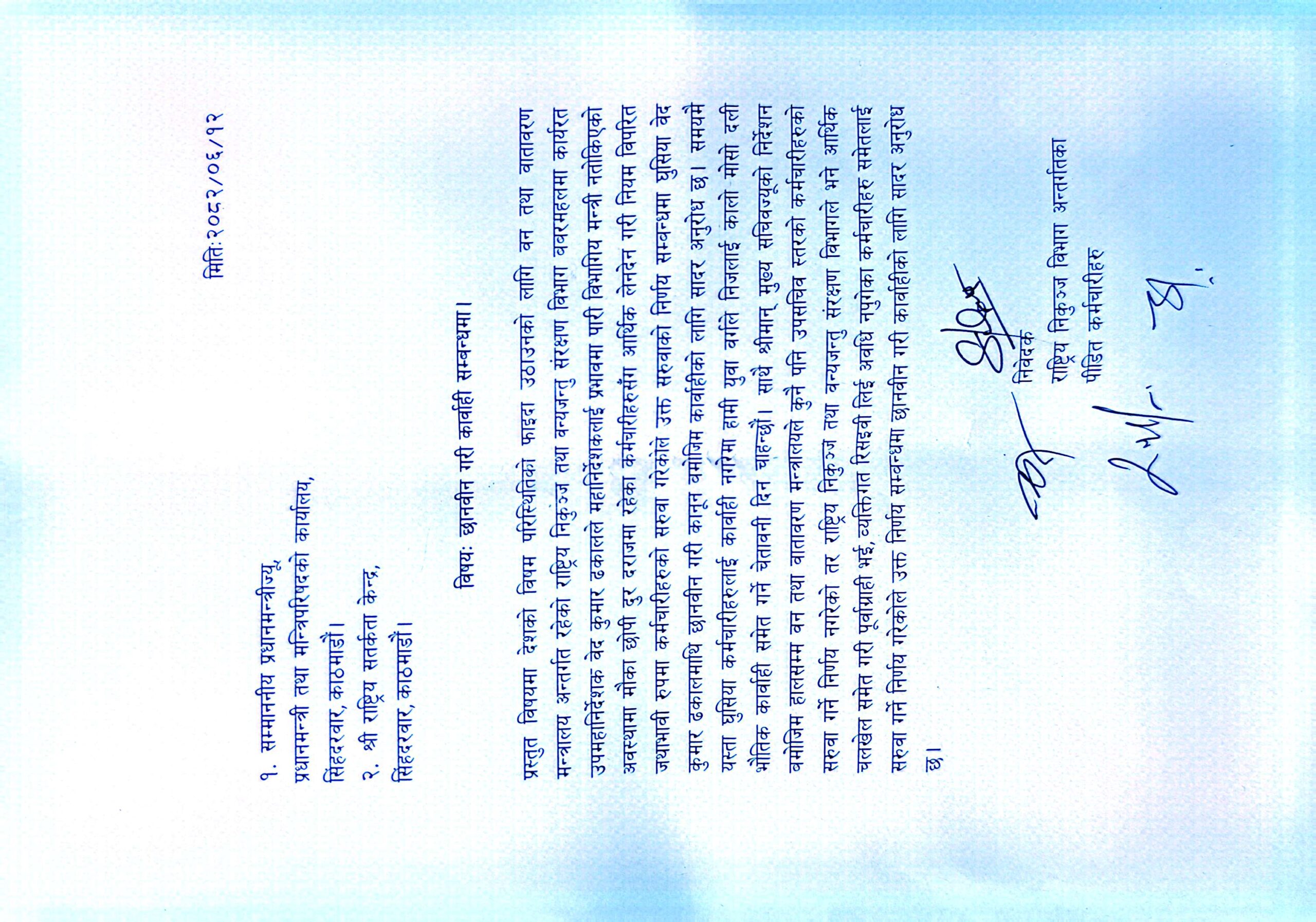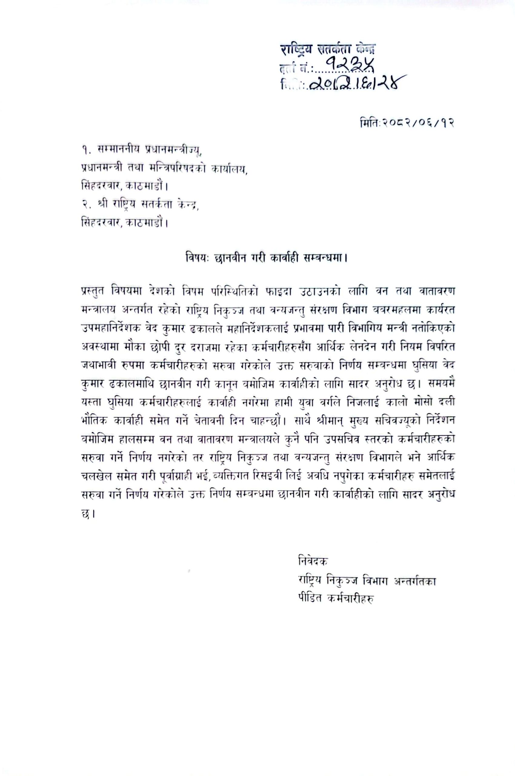 मुख्य सचिवको निर्देशनअनुसार वन तथा वातावरण मन्त्रालयले अहिलेसम्म कुनै पनि उपसचिवस्तरका कर्मचारी सरुवा नगरेको तर निकुञ्ज विभागमा भने ढकालले अवैध चलखेलमार्फत अवधि नपुगेका कर्मचारीसम्मलाई सरुवा गरेको उजुरीमा उल्लेख छ।