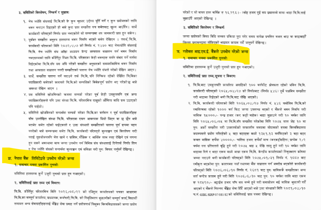 यस्तै, नेपाल बैंकलाई बैंक काउण्टर सञ्चालनका लागि विसं २०७५ असार २८ गते प्रतिस्पर्धाका आधारमा ६६७ वर्गमिटरको भवन भाडामा दिएको भेटिएको प्रतिवेदनमा उल्लेख छ । सम्झौता १० वर्षको हुने र उक्त भवनको मासिक भाडा बापत बैंकले पहिलो २ वर्षको लागि प्रतिमहिना २५ हजार रुपैयाँ तिर्ने रहेको छ । साथै प्रत्येक दुई वर्षमा मासिक भाडामा १० प्रतिशत थप गरी क्याम्पसलाई बुझाउने र विद्युत तथा पानीको लागतको बिल अनुसारको पैसा बैंकले तिर्ने सहमति भएको भेटिएको प्रतिवेदनमा उल्लेख छ ।