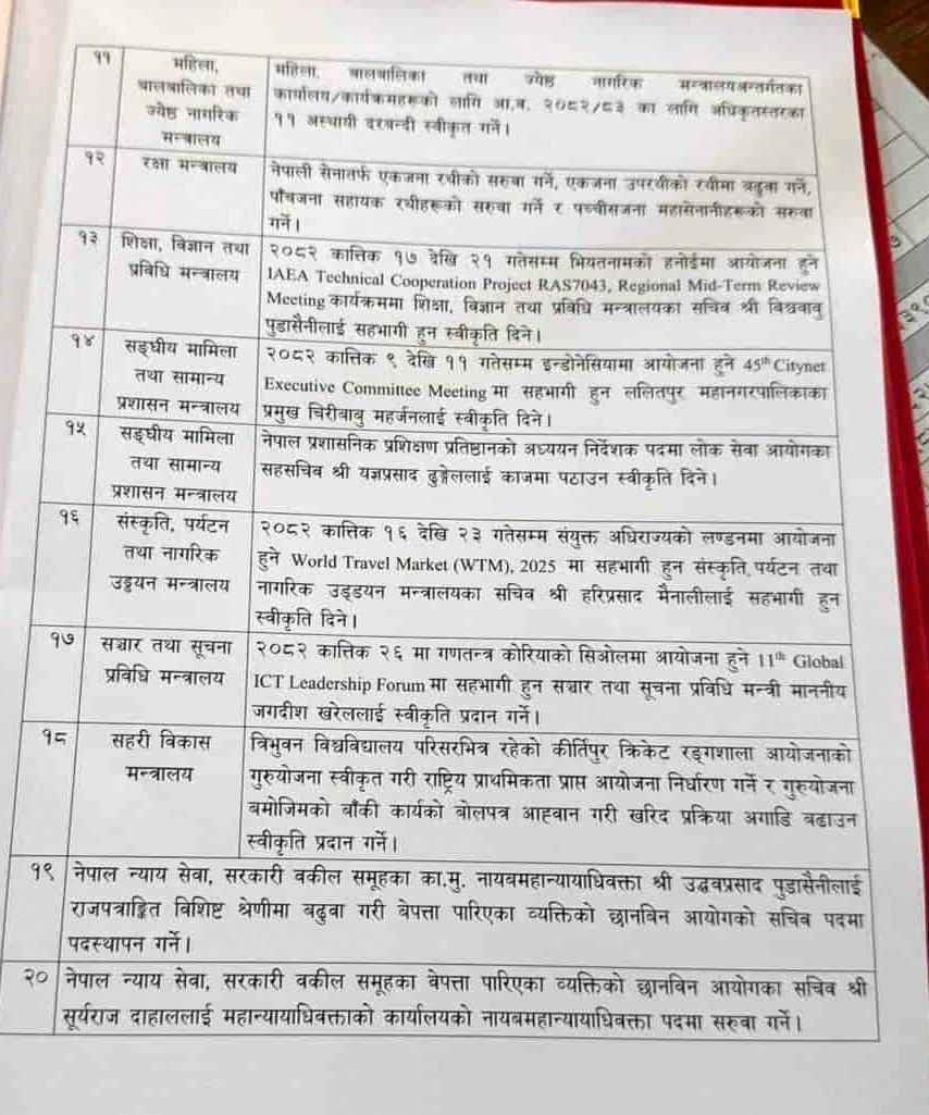 क्याविनेटले यस्तै विशेष अदालतमा कार्यरत नेपाल न्याय सेवा, न्याय समूह, राजपत्राङ्कित प्रथम श्रेणीका रजिस्ट्रार जितेन्द्रबाबु थपलियालाई नेपाल न्याय सेवाको राजपत्राङ्कित विशिष्ट श्रेणीको पदमा बढुवा नियुक्ति गरी न्याय परिषद्को सचिव पदमा पदस्थापन गर्ने,उच्च अदालत पाटनका न्यायाधीश चन्द्रबहादुर सारूलाई सो अदालतको कामकाजसमेत गर्ने गरी काठमाडौँ उपत्यका विकास प्राधिकरणको पुनरावेदन समितिको अध्यक्ष तोक्ने, महिला बालबालिका तथा ज्येष्ठ नागरिक मन्त्रालयअन्तर्गतका आव २०८२ ८३ का लागि अधिकृतस्तरका ११ अस्थायी दरबन्दी स्वीकृत गर्ने,नेपाली सेनातर्फ एकजना रथीको सरुवा गर्ने, एकजना उपरथीको रथीमा बढुवा गर्ने, पाँचजना सहायक रथीहरूको सरुवा गर्ने र पच्चीसजना महासेनानीहरूको सरुवा गर्ने,नेपाल प्रशासनिक प्रशिक्षण प्रतिष्ठानको अध्ययन निर्देशक पदमा लोक सेवा आयोगका सहसचिव यज्ञप्रसाद ढुङ्गेललाई काजमा पठाउन स्वीकृति दिने,नेपाल न्याय सेवा, सरकारी वकील समूहका कामु नायबमहान्यायाधिवक्ता उद्धवप्रसाद पुडासैनीलाई राजपत्राङ्कित विशिष्ट श्रेणीमा बढुवा गरी बेपत्ता पारिएका व्यक्तिको छानबिन आयोगको सचिव पदमा पदस्थापन गर्नेका अलवा नेपाल न्याय सेवा, सरकारी वकिल समूहका बेपत्ता पारिएका व्यक्तिको छानबिन आयोगका सचिव सूर्यराज दाहाललाई महान्यायाधिवक्ताको कार्यालयको नायबमहान्यायाधिवक्ता पदमा सरुवा गर्ने लगायतका निर्णय गरेको छ ।