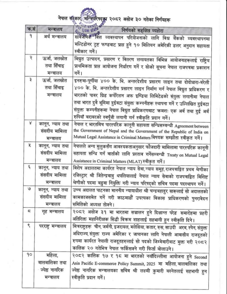 यस्का अलवा सरकारले सार्वजनिक वित्त व्यवस्थापन परियोजनाको लागि विश्व बैंकको व्यवस्थापनमा मल्टिडोनर ट्रष्ट फण्डबाट प्राप्त हुने १० मिलियन अमेरिकी डलर अनुदान सहायता स्वीकार गर्ने,विद्युत उत्पादन, प्रशारण र वितरण लगायतका विभिन्न आयोजनाहरूलाई राष्ट्रिय प्राथमिकता प्राप्त आयोजना निर्धारण गर्ने र सोको सूचना नेपाल राजपत्रमा प्रकाशन गर्ने,इनरुवा पूर्णीया ४ सय केभी अन्तरदेशीय प्रशारण लाइन तथा दोधारा (बरेली ४०) केभी अन्तरदेशीय प्रशारण लाइन निर्माण गर्न नेपाल विद्युत प्राधिकरण र भारतको पावर ग्रिड कर्पोरेशन अफ इण्डिया लिमिटेडको संयुक्त लगानीमा नेपाल तथा भारत दुवै भूमिमा दुई वटा संयुक्त कम्पनीहरू स्थापना गर्ने र उल्लिखित दुई वटा संयुक्त कम्पनीहरूमा नेपाल विद्युत प्राधिकरणबाट क्रमशः एक अर्ब तथा दुई अर्ब रुपैयाँ बराबरको स्वपुँजी लगानी गर्न स्वीकृति प्रदान गर्ने,नेपाल र भारतबिच पारस्परिक कानूनी सहायता सन्धिसम्बन्धी एग्रिमेण्ट बिटुइन द गभमेंण्ट अफ नेपाल एण्ड गभमेण्ट अफ द रिपब्लिक इण्डिया अन म्युचअल लिगल एसिस्टेन्स म्याटर्स विषयक सम्झौता स्वीकृत गर्ने,नेपालले अन्य मुलुकसँग आवश्यकताअनुसार फौजदारी मामिलामा पारस्परिक कानूनी सहायता सन्धि गर्न वार्ताको लागि प्रश्ताव गर्नेसम्बन्धी ट्रिटी अन म्युचअल लिगल एसिस्टेन्स इन क्रिमिनल म्याटर्स स्वीकृत गर्ने लगायतका निर्णय गरेको छ ।