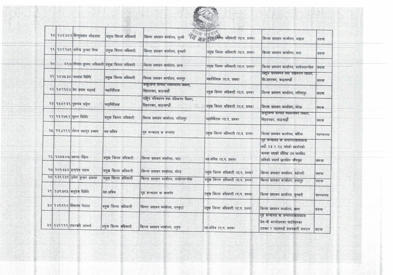 काठमाडौँ । गृह मन्त्रालयले देशभरका ३६ जना प्रमुख जिल्ला अधिकारी (प्रजिअ)हरूको सरुवा गरेको छ। आइतबार सार्वजनिक निर्णय अनुसार मन्त्रालयले रुपन्देही, कैलाली, महोत्तरी, पर्सा, बाँके, बर्दिया, रौतहट, कपिलवस्तु, सुर्खेत, झापा लगायतका जिल्लाका प्रमुख जिल्ला अधिकारीहरूलाई नयाँ जिम्मेवारी तोकिएको हो।