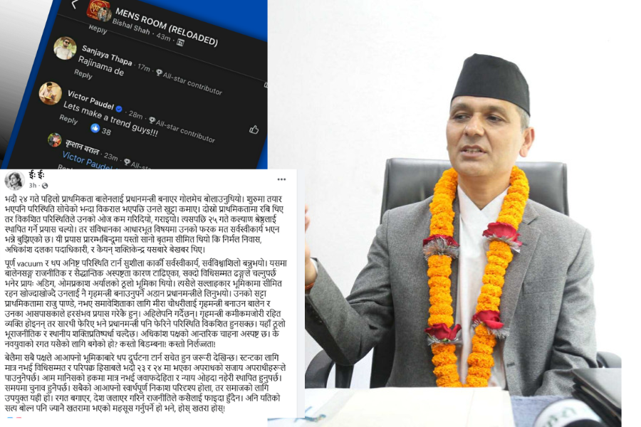 थप अनिष्ट परिस्थिति टार्न सुशीला कार्की सर्वस्वीकार्य, सर्वविश्वाशिलो बन्नुभयो। यसमा बालेनसङ्ग राजनीतिक र सैद्धान्तिक अस्पष्टता कारण टाढिएका, सक्दो विधिसम्मत ढङ्गले चल्नुपर्छ भनेर प्रायः अडिग, ओमप्रकाश अर्यालको ठूलो भूमिका थियो। त्यसैले सल्लाहकार भूमिकामा सीमित रहन खोज्दाखोज्दै उनलाई नै गृहमन्त्री बनाउनुपर्ने अडान प्रधानमन्त्रीले लिनुभयो। उनको सट्टा प्राथमिकतामा राजु पाण्डे, नभए समावेशिताका लागि मीरा चौधरीलाई गृहमन्त्री बनाउन बालेन र उनका आसपासकाले हरसंभव प्रयास गरेकै हुन्। अहिलेपनि गर्दैछन्। गृहमन्त्री कमीकमजोरी रहित व्यक्ति होइनन् तर सारथी फेरिए भने प्रधानमन्त्री पनि फेरिने परिस्थिति विकशित हुनसक्छ।
