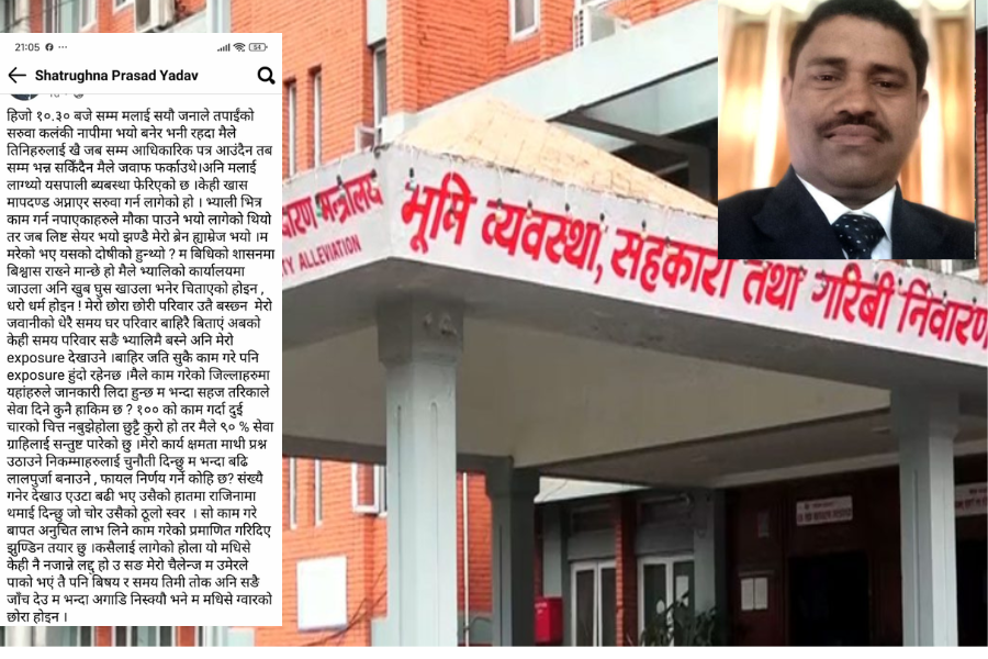 उनले लेखेका छन्,‘हिजो १०.३० बजेसम्म मलाई सयौँ जनाले तपाईँको सरुवा कलंकी नापीमा भयो बनेर भनिरहँदा मैले तिनीहरूलाई खै जबसम्म आधिकारिक पत्र आउँदैन, तबसम्म भन्न सकिँदैन, मैले जवाफ फर्काउँथेँ । अनि मलाई लाग्थ्यो यसपालि व्यवस्था फेरिएको छ ।खास मापदण्ड अपनाएर सरुवा गर्न लागेको हो । भ्यालीभित्र काम गर्न नपाएकाहरूले मौका पाउने भयो लागेको थियो तर जब लिष्ट सेयर भयो । झण्डै मेरो ब्रेन ह्याम्ब्र्रेज भयो । म मरेको भए यसको दोषीको हुन्थ्यो ? म विधिको शासनमा विश्वास राख्ने मान्छे हो मैले भ्यालीको कार्यालयमा जाउँला अनि खुब घुस खाउँला भनेर चिताएको होइन, धरो धर्म होइन १ मेरो छोराछोरी परिवार उतै बस्छन् । मेरो जवानीको धेरै समय घर परिवार बाहिरै बिताएँ । अबको केही समय परिवारसँग भ्यालीमै बस्ने अनि मेरो एक्सपोजर देखाउने । बाहिर जतिसुकै काम गरे पनि एक्सपोजर हुँदोरहेनछ । मैले काम गरेका जिल्लाहरूमा यहाँहरूले जानकारी लिँदा हुन्छ म भन्दा सहज तरिकाले सेवा दिने कुनै हाकिम छ ? १ सयको काम गर्दा दुई चारको चित्त नबुझे होला छुट्टै कुरो हो तर मैले ९० प्रतिशत सेवाग्राहीलाई सन्तुष्ट पारेको छु । मेरो कार्यक्षमतामाथि प्रश्न उठाउने निकम्माहरूलाई चुनौती दिन्छु म भन्दा बढी लालपुर्जा बनाउने, फायल निर्णय गर्ने कोही छ ? संख्यै गनेर देखाऊ, एउटा बढी भए उसैको हातमा राजीनामा थमाइदिन्छु । जो चोर उसैको ठूलो स्वर । सो काम गरेबापत अनुचित लाभ लिने काम गरेको प्रमाणित गरिदिए झुण्डिन तयार छु । कसैलाई लागेको होला यो मधिसे केही नजान्ने हो ऊसँग मेरो चैलेन्ज । म उमेरले पाको भएँ । तैपनि विषय र समय तिमी तोक अनि सँगै जाँच देऊ, म भन्दा अगाडि निस्क्यौ भने म मधिसे ग्वारको छोरा होइन ।’