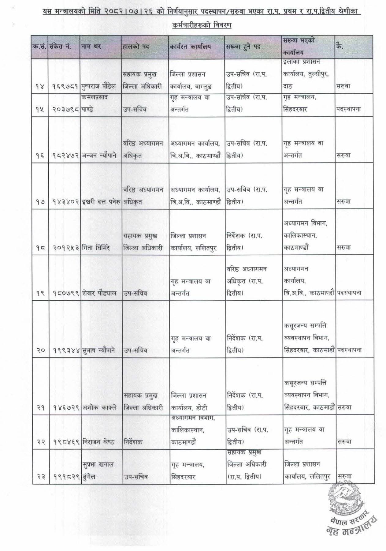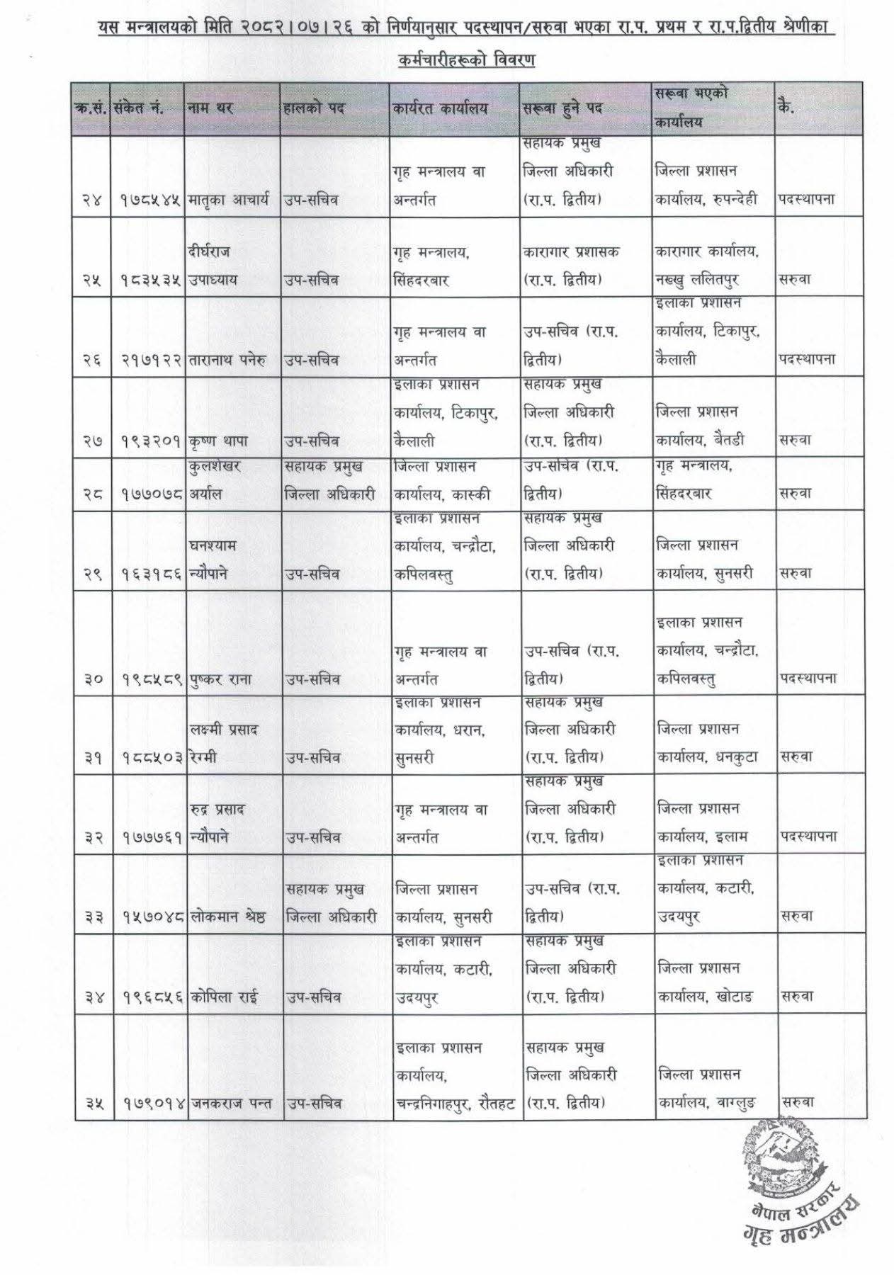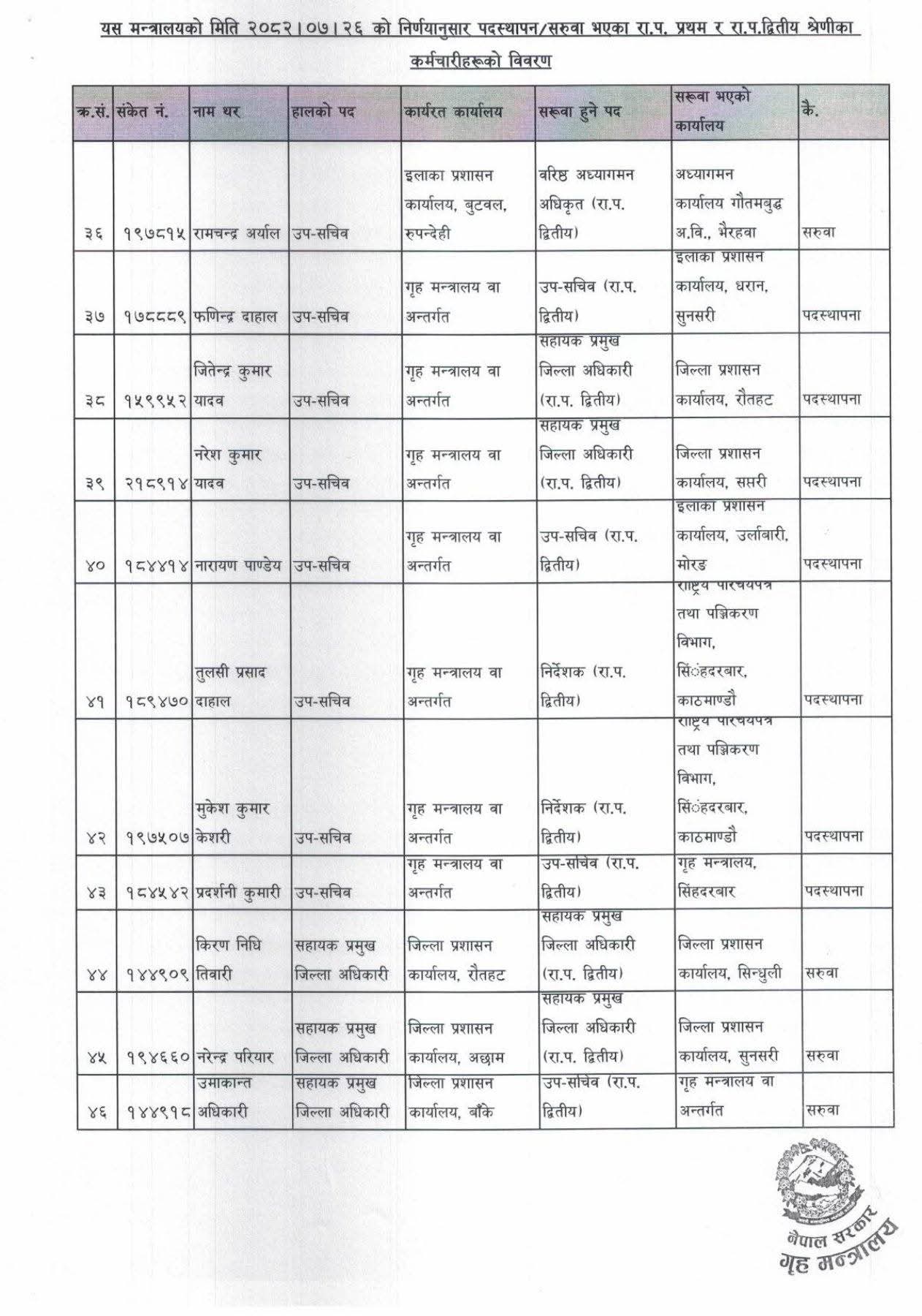 दैलेखका सिडिओ रहेका बद्रीनाथ गैरेलाई गुल्मीको सिडिओ, गुल्मीमा कार्यरत आनन्द सारुलाई दैलेख, रोल्पामा कार्यरत वासुदेव दाहाललाई पाँचथर, जुम्लाका खिमबहादुर रायमाझीको गृह मन्त्रालयमा सरुवा भएको छ।