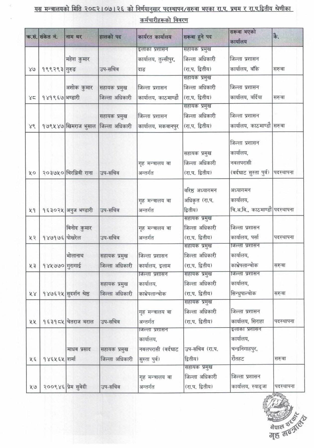 रोल्पामा गंगाबहादुर क्षेत्री, जुम्लामा दीपक पौडेल, डोटीमा कल्पना घिमिरे नेपाल तथा मुस्ताङमा मोहनराज जोशीलाई प्रमुख जिल्ला अधिकारीको रुपमा खटाइएको छ।
