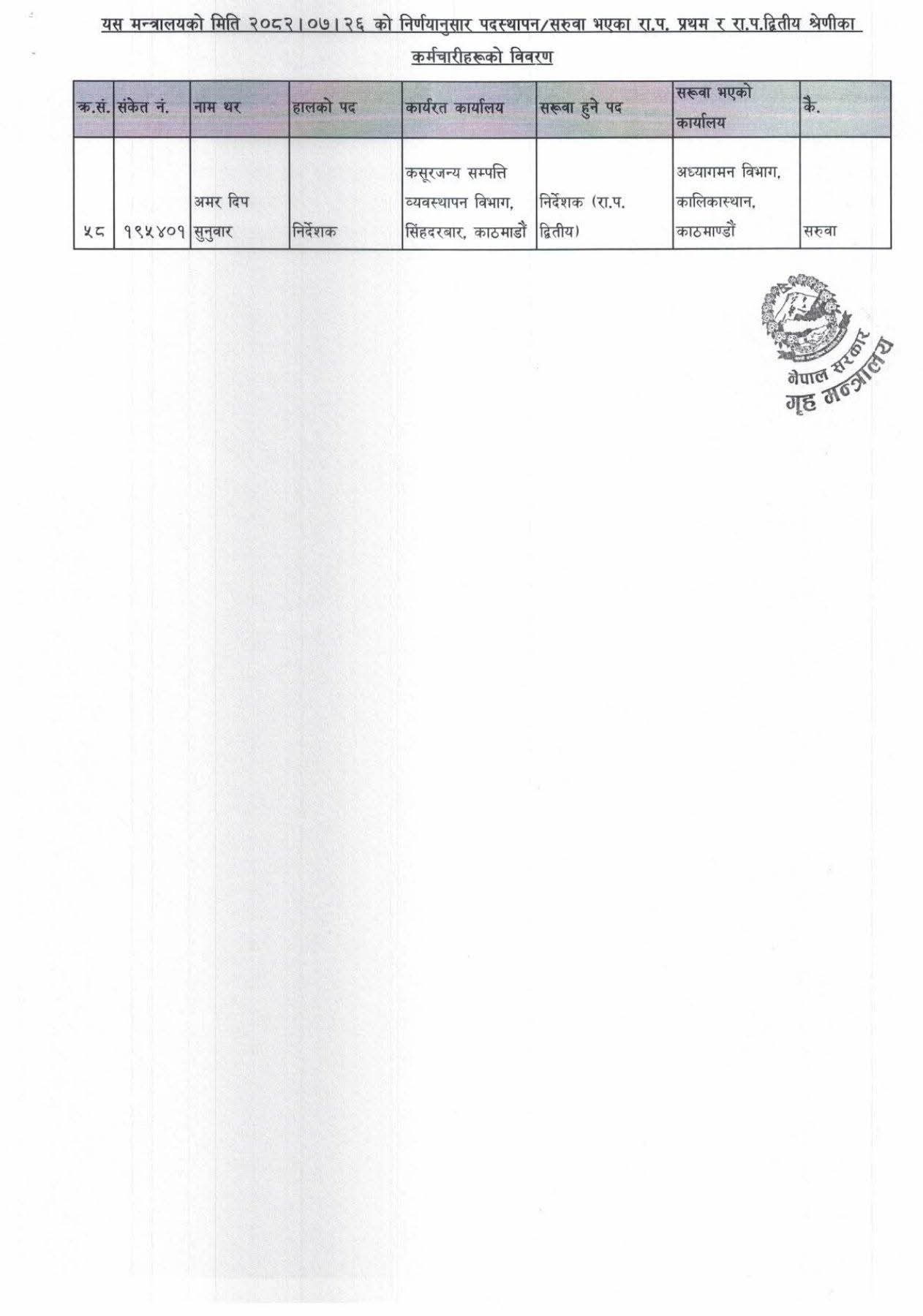नियमित प्रशासनिक व्यवस्थापन र कार्यक्षमता बढाउने उद्देश्यका साथ गरिएको सरुवामा केन्द्र र प्रदेश दुबै तहका कार्यालयहरू प्रभावित भएका छन्।