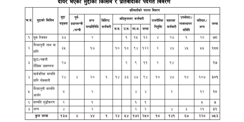 अख्तियारले गैरकानुनी सम्पत्ति आर्जनमा २० प्रतिवादीमध्ये ९ जना महिला प्रतिवादी छन् । उनीहरुसँग अख्तियारले १४ करोड ९७ लाख मागदावी लिएको छ । अख्तियारले बर्षभरमा ७५३ जनालाई प्रतिवादी बनाएर मुद्धा चलाउँदा राष्ट्रसेवक कर्मचारीहरुमात्र ३९२ जना रहेका छन् । जसमध्ये सचिव १,सहसचिव २४,उपसचिव २४ र शाखा अधिकृत १७२ जना रहेका छन् भने सहायकस्तरका १४१ जना रहेको अख्तियारले जनाएको छ ।