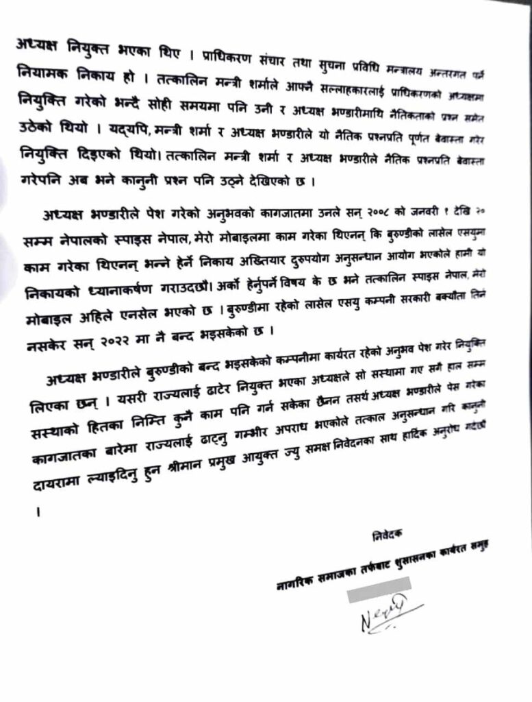 विज्ञापनमा निजी क्षेत्रमा सञ्चार प्रविधि क्षेत्रमा १० वर्ष काम गरेकाहरू योग्य हुने भनेर तोकिए पनि सरकारी निकायमा उपल्लो पदबाहेक अन्यमा १० वर्ष अनुभव हासिल गरेकाहरू अयोग्य हुने गरी प्रावधान राखियो । प्राधिकरणको अध्यक्षका पूर्व सचिवदेखि एक से एक काविलहरु मैदानमा थिए तर भण्डारीले नियुक्ति भेट्टाए । अझैं रोचक त भण्डारीलाई नियुक्ति दिलाउनकै लागि सात महिना कार्यकाल बाँकी रहदै पुरुषोत्तम खनाललाई राजीनामा गर्न लगाइएको थियो ।