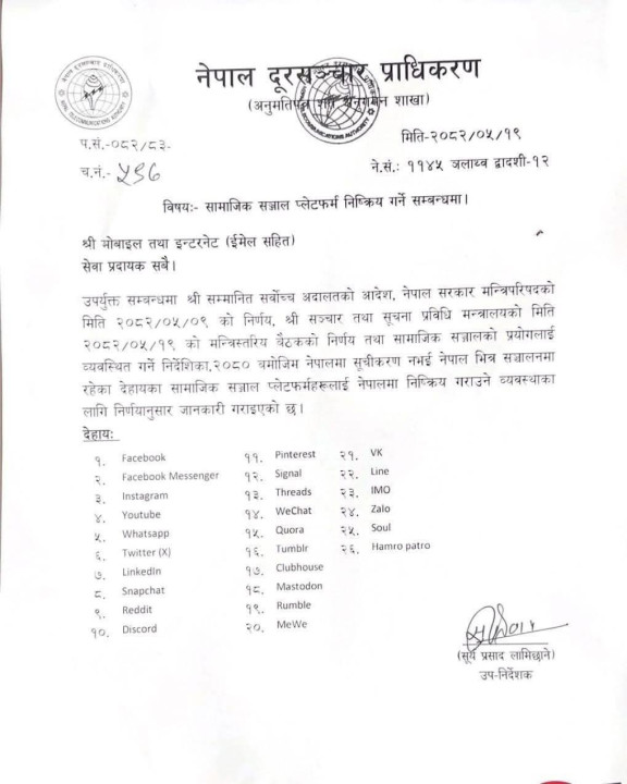 कल्पना गरौं, नेपाल दूरसञ्चार प्राधिकरणले गत भदौं १९ मा २६ वटा सामाजिक प्लेटफर्म निस्क्रिय नपारिदिएको भए के हुन्थ्यो ? भदौं २३ र २४ को जेनजी विद्रोह हुनेथियो । न त जानेथियो अनकाहक ७७ जनाको ज्यान,दुई हजार बढी घाइते । यो घटनाको अगाडि फर्कने हो भने सामाजिक सञ्जाल बन्दको निर्णय प्रमुख कारण थियो । सामाजिक सञ्जाल बन्द गर्ने कार्य दूर सञ्चार प्राधिकरणले गरेको हो । भलै यसमा मन्त्रिपरिषद्को निर्णय अनुसार सञ्चार मन्त्रालयले निर्देशन पछि दूरसञ्चार प्राधिकरणले २६ वटा सामाजिक सञ्जाल निस्क्रिय पारिएको थियो ।