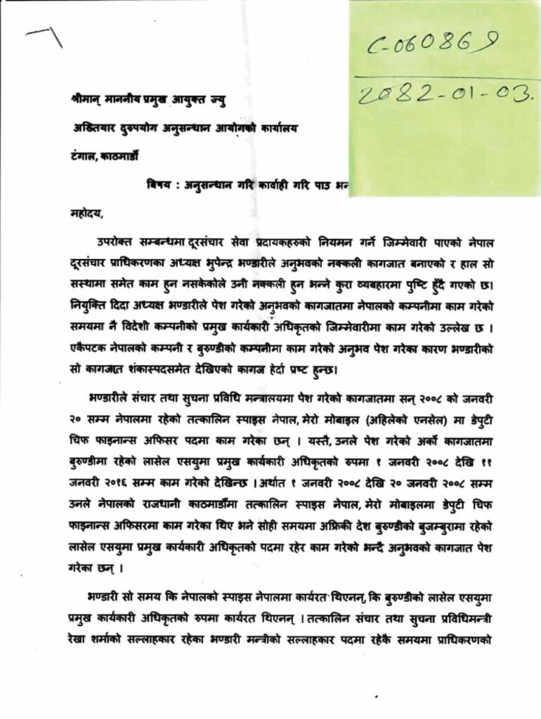 यो घटनामा उतिकै दोषी र जिम्मेवार पात्र हुन्, भण्डारी । तर उनीमाथि कुनै अनुसन्धान,कारवाही भएको सुनिदैन । रेखा शर्मा सञ्चारमन्त्री हुँदा उनका सल्लाहकार हुँदै आफू सल्लाहकार हुँदा आफू अनुकुलको प्रावधान राखेर उनी दूरसञ्चार प्राधिकरणमा छिरेका हुन भण्डारी । प्राधिकरणको अध्यक्षका लागि २०८० माघ १४ गते विज्ञापन खुल्यो । सो विज्ञापन खुलाइँदा जसरी जानुका ढकालका लागि योग्यता नै परिमार्जन गरिएको थियो ठीक उही शैलीले दूरसञ्चार ऐन, २०५३ मा तोकिएको योग्यतालाई खुम्च्याइएको थियो । प्राधिकरणको गठन सम्बन्धी ऐनको दफा ५ मा उल्लेखित व्यवस्था अन्तर्गत उपदफा ९१० मा भनिएको छ, “प्राधिकरणमा दूरसञ्चार सेवासँग सम्बन्धित प्राविधिक र प्रशासनिक, बजार व्यवस्थापन, लेखा तथा लेखापरीक्षण वा कानूनी क्षेत्रमा तोकिए बमोजिम योग्यता र अनुभव भएका अध्यक्षसहित पाँचजना सदस्यहरू रहनेछन् ।