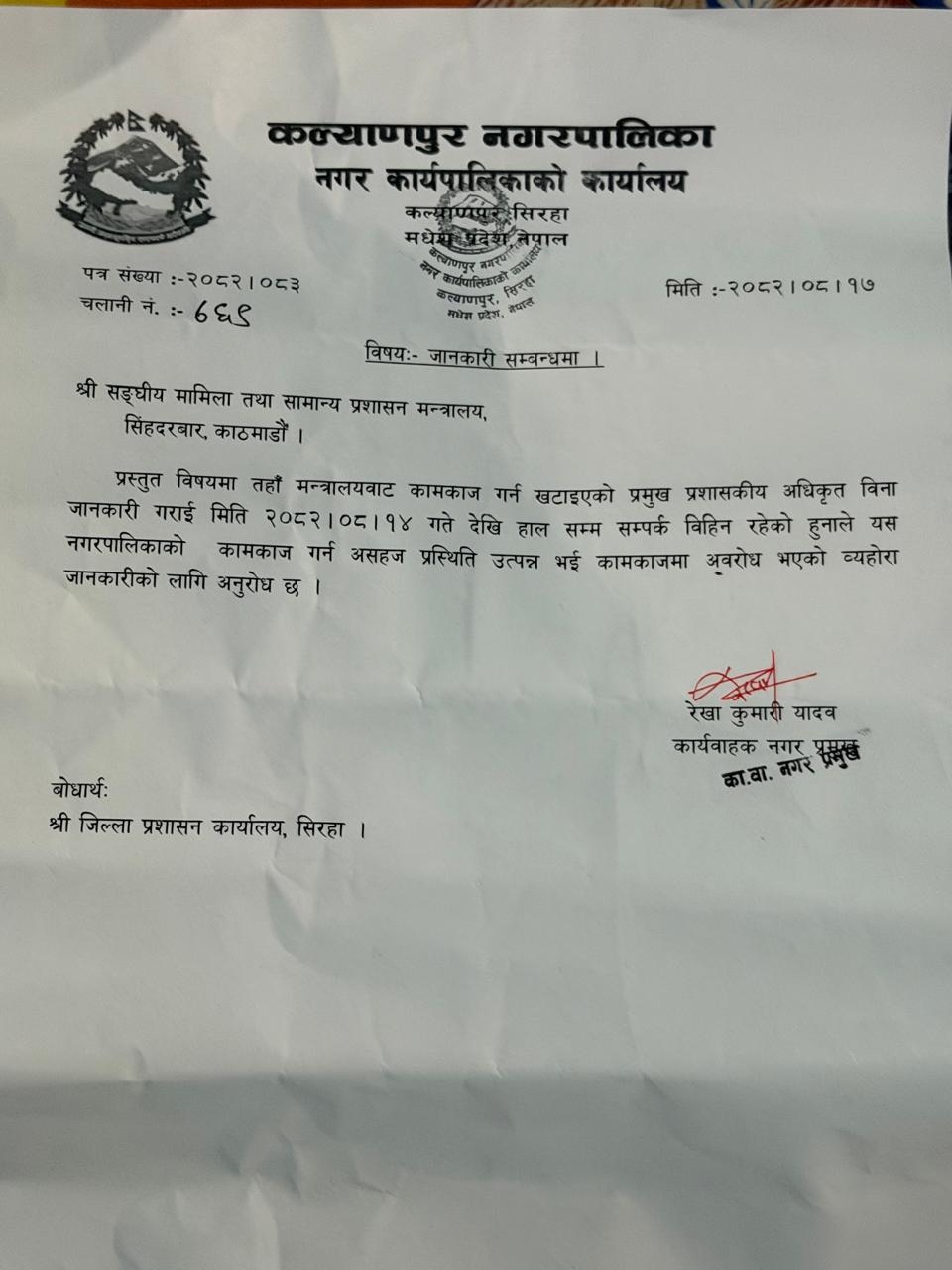 स्थिति गम्भीर भएपछि नगरपालिकाले जिल्ला प्रशासन कार्यालय सिरहा र संघीय मामिला तथा सामान्य प्रशासन मन्त्रालयलाई लिखित जानकारी पठाएको छ। तर कार्यालय प्रमुखको अवस्थाबारे अझै कुनै जवाफ आएको छैन।