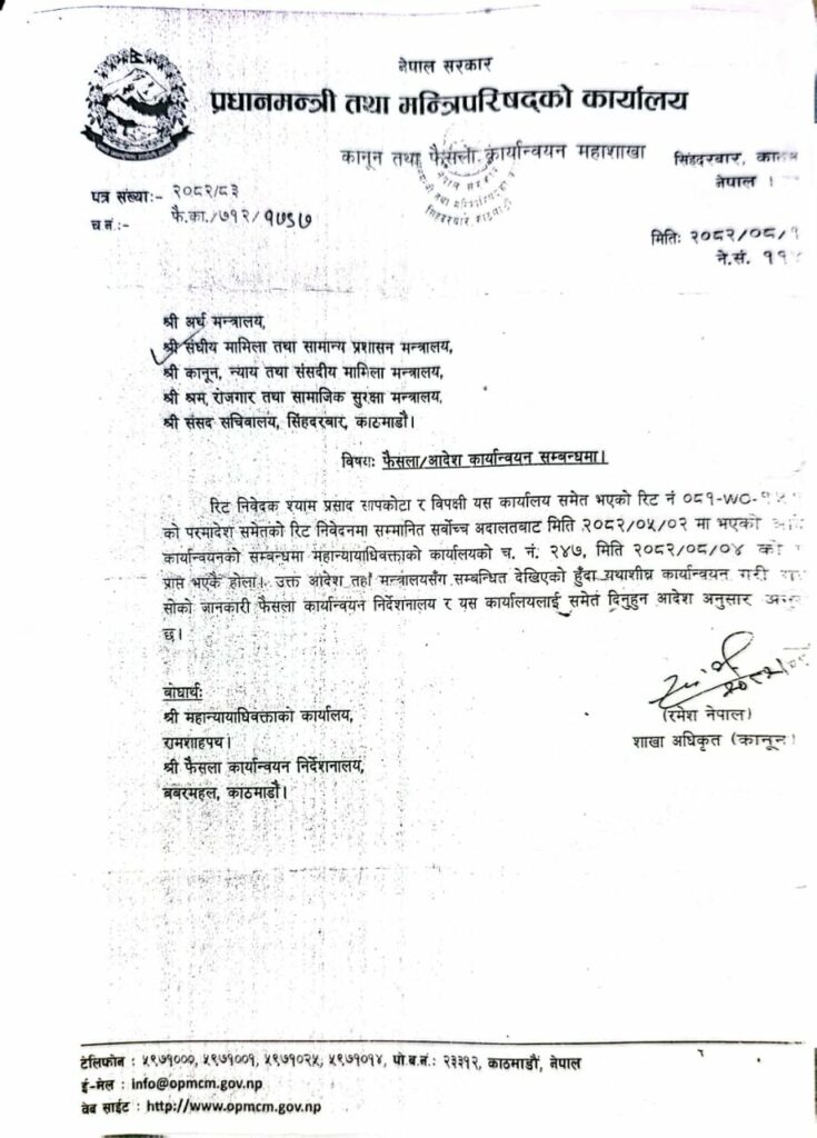 प्रधानमन्त्री तथा मन्त्रिपरिषद्का कार्यालयका कानुन अधिकृत रमेश नेपालले संघीय मामिला तथा सामान्य प्रशासन मन्त्रालयलाई करार सेवाका कर्मचारीहरुलाई समेत मंहगी भत्ता उपलव्ध गराउने सर्वाेच्च अदालतका न्यायधीशद्धय हरिप्रसाद फुयाँल र श्रीकान्त पौडेलको संयुक्त इजलासबाट जारी भएको परमादेश कार्यान्वयन गर्न परिपत्र गरेको हो ।
