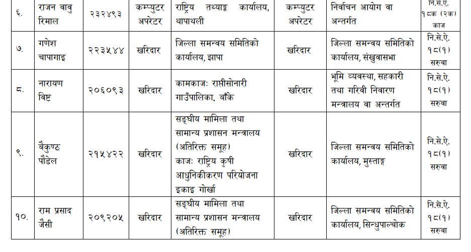 मन्त्रालयले बुधबारको निर्णय अनुसार,१०८ नायब सुब्बा,२७ कम्युटर अपरेटर र २ सर्भेक्षक,१ जना मेकानिकल इञ्जिनियर गरी १३८ जना नायब सुव्बाहरुको सरुवा गरेको छ । यस्तै मन्त्रालयले ४१ जना खरिदारहरुको सरुवा गरेसँगै ती तहका कर्मचारीहरुको सरुवा स्थगन गर्नका लागि सबै मन्त्रालय, आयोग, सचिवालय र कार्यालयलाई परिपत्र गरेको छ ।