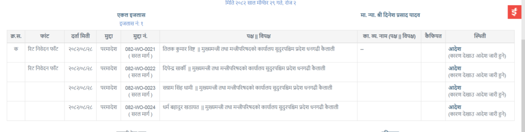 सो प्रदेशभित्रका विभिन्न स्थानीय तहमा कार्यरत कर्मचारीहरु तिलक कुमार विष्ट,दिपेन्द्र सार्की,संग्राम सिंह धामी र धर्मबहादुर खडायतले मुख्यमन्त्री तथा मन्त्रिपरिषद्को कार्यालयलाई विपक्षी बनाउँदै दायर गरेको रिटमा १ नम्बर बेञ्चका न्यायधीश दिनेश प्रसाद यादवको एकल इजलाशले मुख्यमन्त्री तथा मन्त्रिपरिषद्को कार्यालयले १५ दिनभित्र कारण देखाउ आदेश पेश गर्न भनेको छ ।