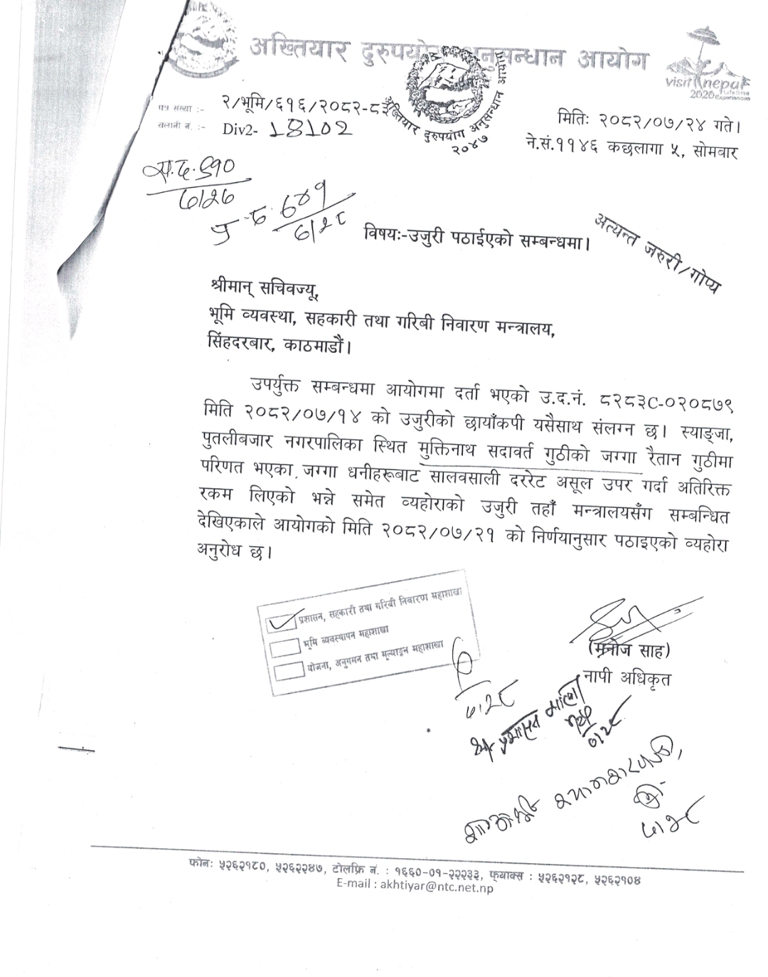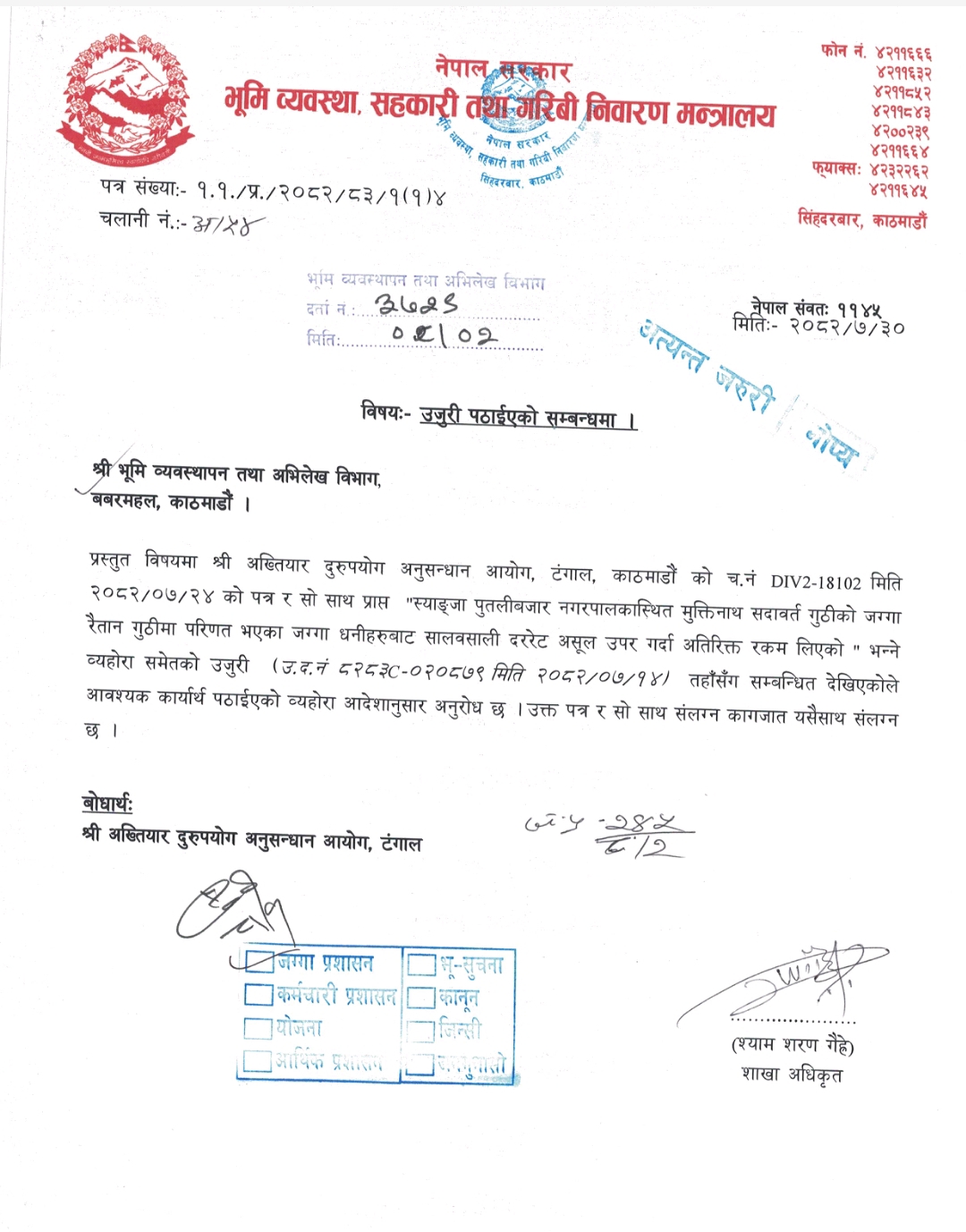 यस प्रकरणमा अख्तियार दुरुपयोग अनुसन्धान आयोगमा उजुरी दर्ता भई उ.द. नं. ८२८३८–०२०८७९ (मिति २०८२/०७/१४) कायम भएको छ। आयोगले प्रारम्भिक अध्ययनपछि उक्त विषय नीतिगत र व्यवस्थापनसँग सम्बन्धित देखिएको भन्दै मिति २०८२/०७/२१ को निर्णयअनुसार उजुरी भूमि व्यवस्था, सहकारी तथा गरिबी निवारण मन्त्रालय मा पठाएको जनाएको छ। आयोगले कार्तिक २४ गते मन्त्रालयलाई पत्राचार गरी आवश्यक अनुसन्धान र कारबाही गर्न अनुरोध गरेको हो।