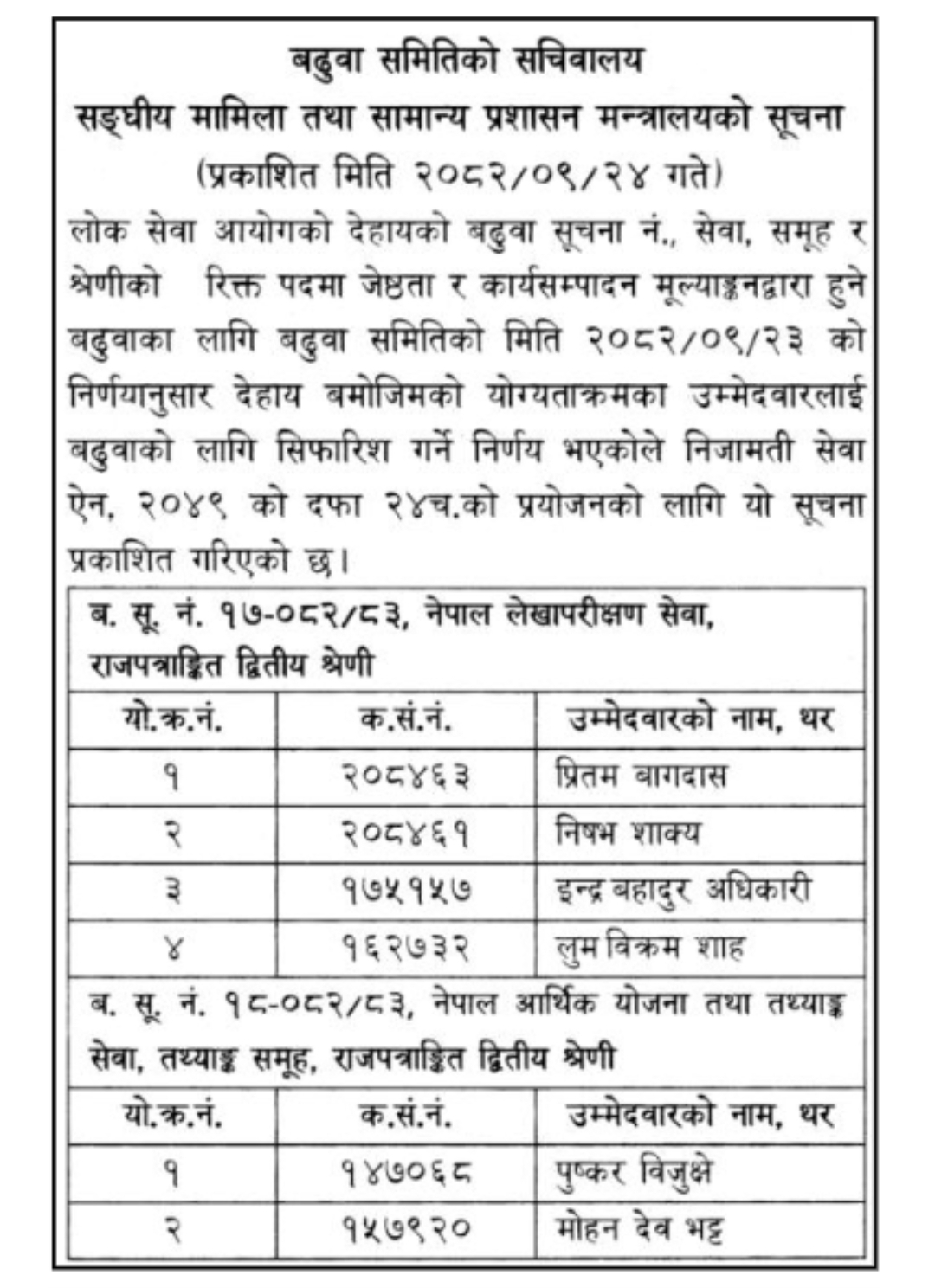 त्यस्तै, नेपाल आर्थिक योजना तथा तथ्यांक सेवा अन्तर्गत तथ्यांक समूहबाट पुष्कर विजुक्षे र मोहन देव भट्टलाई उपसचिव पदका लागि सिफारिस गरिएको सूचनामा उल्लेख छ।मन्त्रालयका अनुसार प्रक्रिया अनुसार आवश्यक औपचारिकता पूरा भएपछि सिफारिस कार्यान्वयनमा जानेछ।