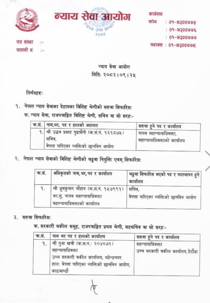 न्याय सेवा आयोगले उपसचिव,सहसचिवदेखि सचिव तहका कर्मचारीहरुको सरुवा गरेको छ ।