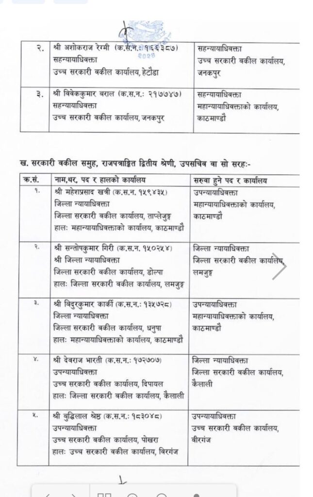 यस्तै,सरकारी वकिलतर्फ पूजा खत्रीलाई उच्च सरकारी वकिलको कार्यालय हेटौंडामा सहमहान्यायधिवक्तको जिम्मेवारी दिएर पठाइएको छ भने त्यहाँ कार्यरत रहेका अशोकराज रेग्मीलाई उच्च सरकारी वकिलको कार्यालय जनकपुर र जनकपुरमा कार्यरत विवेक कुमार वराललाई सहमहान्यायधिवक्तको जिम्मेवारीसहित महान्यायधिवक्ताको कार्यालयमा ल्याइएको छ ।