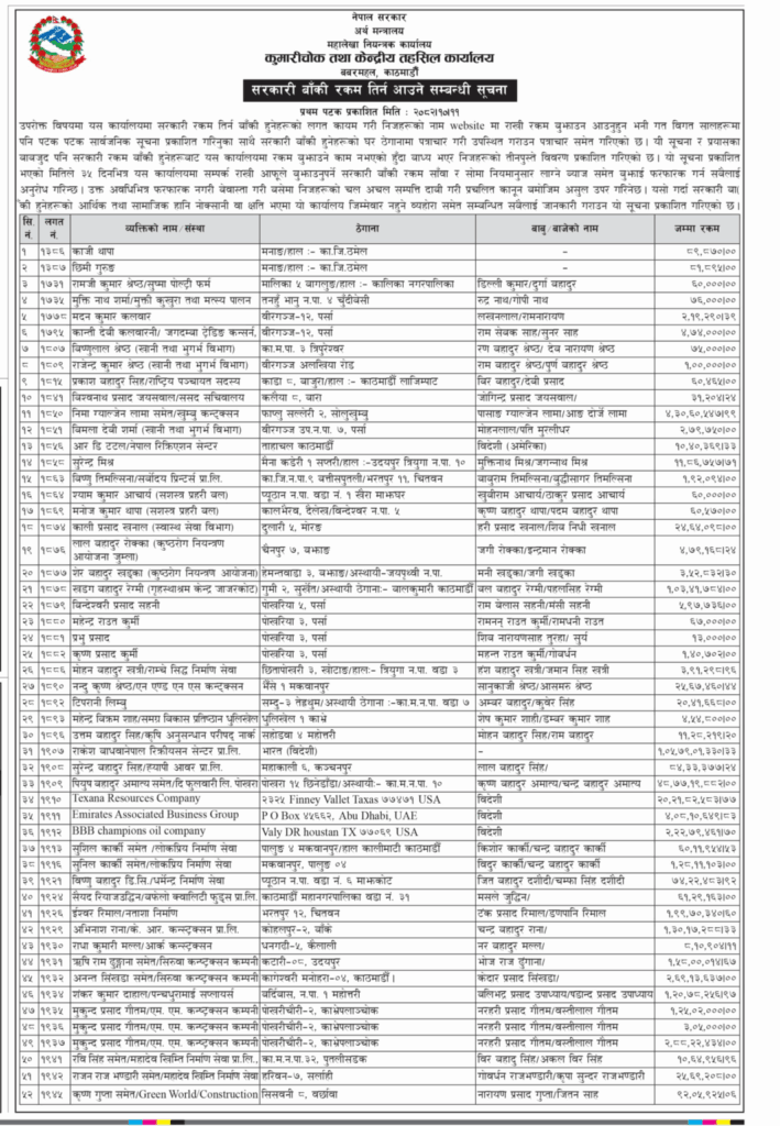 सरकारलाई तिर्नुपर्ने बाँकी बक्यौता लामो समयसम्म नबुझाउने व्यक्ति तथा संस्थाहरूको नाम सार्वजनिक भएको छ ।