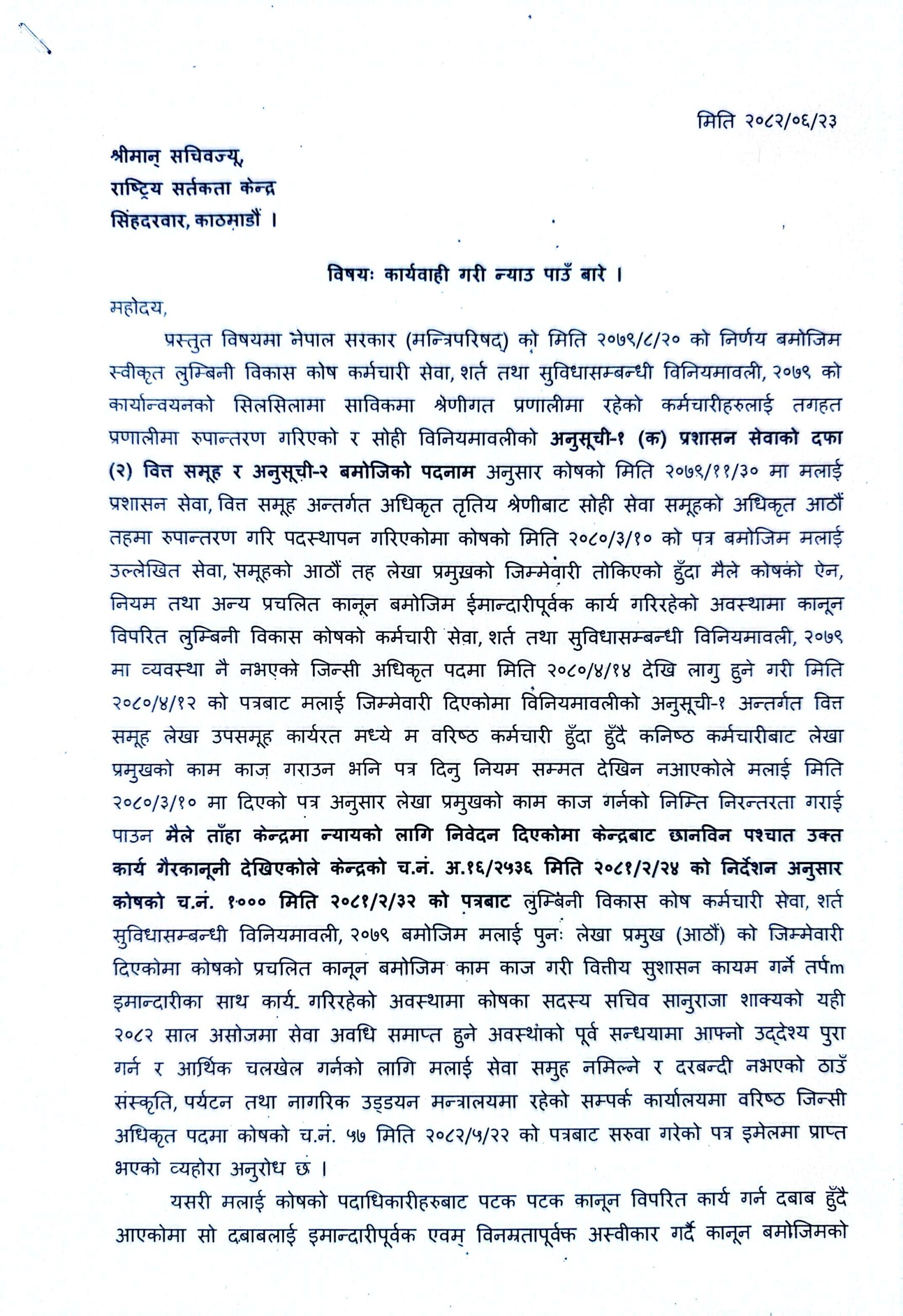 सेवा समूह नमिल्ने र दरबन्दी नभएको ठाउँमा अधिकृतको सरुवा,कारवाहीको माग गर्दै केन्द्रमा उजुरी
