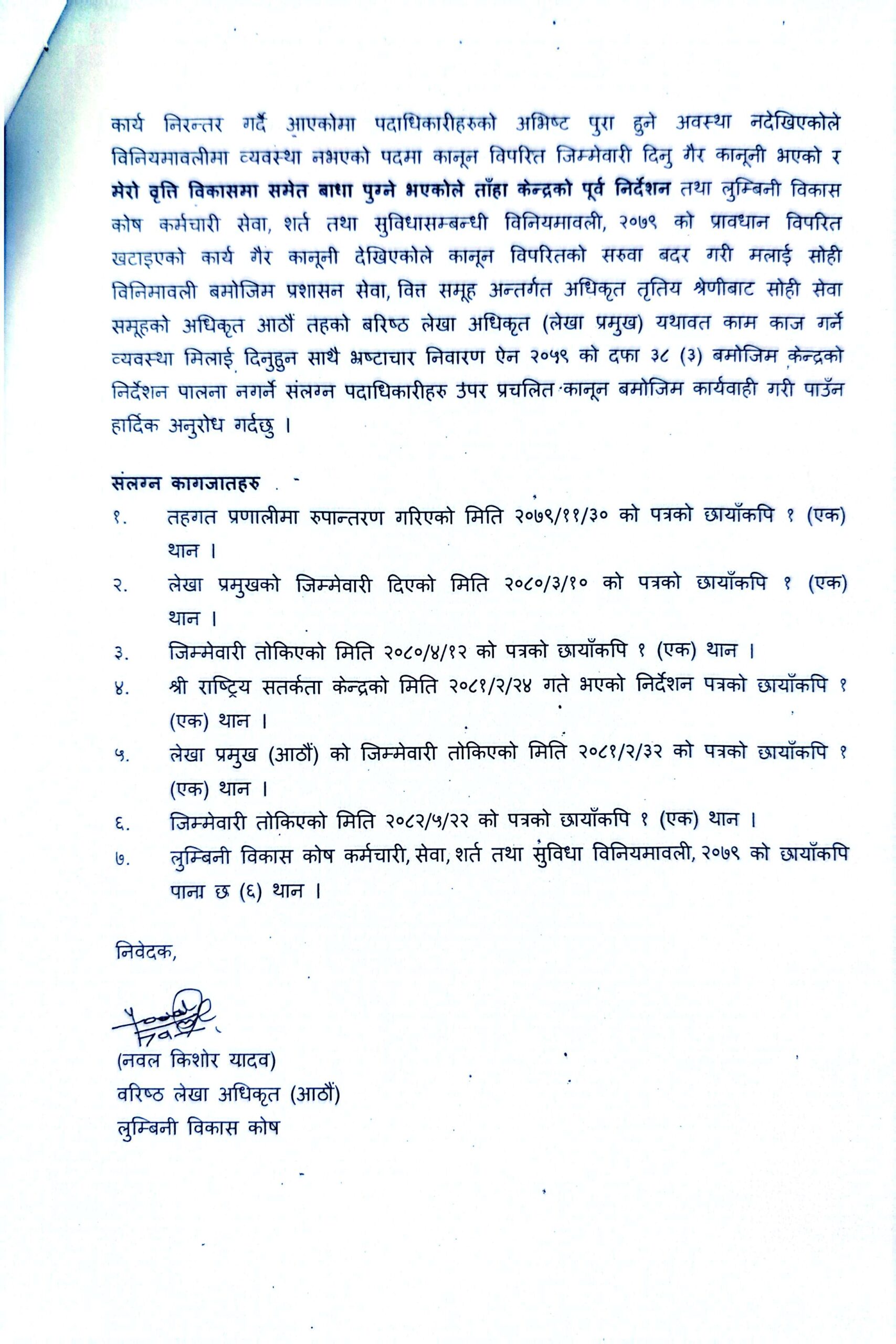 नेपाल सरकार मन्त्रिपरिषद्को निर्णयअनुसार स्वीकृत लुम्बिनी विकास कोष कर्मचारी सेवा, शर्त तथा सुविधासम्बन्धी विनियमावली, २०७९ बमोजिम विधिवत् रूपमा प्रशासन सेवा, वित्त समूह अन्तर्गत अधिकृत आठौं तहमा रुपान्तरण भई पदस्थापित यादवलाई २०८० असार १० मा लेखा प्रमुखको जिम्मेवारी दिइएको थियो। त्यो जिम्मेवारी कुनै कृपादान होइन, कानूनले दिएको अधिकार थियो। तर उनले कानूनअनुसार काम गर्न थालेपछि, हिसाबकिताब मिलाएर चल्न थालेपछि, आर्थिक चलखेलमा आँखा चिम्लन अस्वीकार गरेपछि कोषभित्र खलबली मच्चियो।