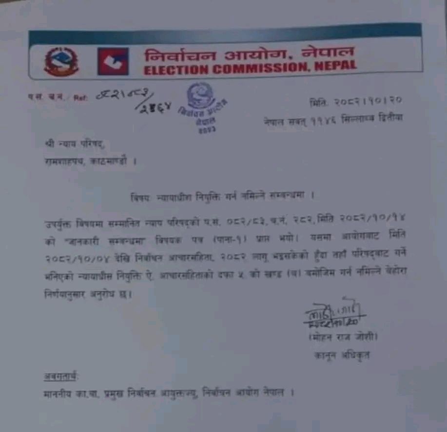 यस अघि निर्वाचन आयोगले न्यायधीश नियुक्ति नगर्न न्याय परिषद्लाई पत्रै पठाएको थियो । गत माघ ४ गतेदेखि निर्वाचन आचारसंहिता जारी भइसकेको उल्लेख गर्दै आयोगले न्यायधीश नियुक्ति नगर्न न्यायपरिषद्लाई पत्र पठाएको हो । न्यायपरिषद् सचिवालयले गत माघ १४ गते आयोगलाई पत्र पठाएर सहमतिका लागि आग्रह गरेको थियो ।