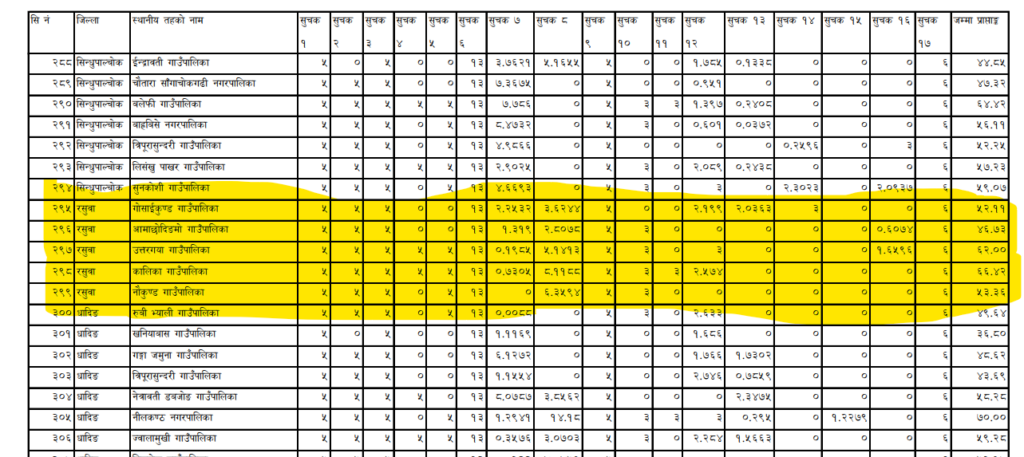 यस्तै जिल्लाका पाँच पालिकामध्ये कार्यसम्पादन मूल्यांकनका आधारमा नौकुण्ड गाउँपालिका तेस्रो स्थानमा रहेको छ । सो पालिकाले ५३ दशमलव ३६ अंक पाउदा एमालेकै नेता पालिका अध्यक्ष रहेको र सदरमुकाम धुञ्जे जोडिएको गोसाइकुण्ड पालिकाले ५२ दशमलव ११ अंक हात पारेको छ । जिल्लाका पाँच पालिकामध्ये सबैभन्दा कमजोर कार्यसम्पादन देखिएको छ आमाछोदिङ्मो गाउँपालिका । सो पालिकाले ४६ दशमलव ७३ अंक हात पारेको छ ।