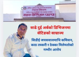 साढे दुई अर्ब बजेटको सडक डिभिजन कार्यालय पाल्पाको नेतृत्व गरिरहेका सिनियर डिभिजनल इञ्जिनियर राम पुकार जयसवाल पुनः गम्भीर विवादको घेरामा तानिएका छन् । जहाँ र जुन कार्यालयको नेतृत्व गर्दछन्,त्यही रहँदा अनेकन विवाद र अदालती झमेला खेपिरहेका उनी सडक डिभिजन दाङबाट केही महिना अगाडि झण्डै २ अर्ब बजेट खेलाउन पाउने कार्यालय पाल्पाको प्रमुख बनेर गएका छन् … Continue reading विवादित सिडीई उल्टै पृरस्कृत : सीमित ठेकेदारलाई पोस्दै ७ प्रतिशतसम्म कमिसन लिने गरेको गम्भीर आरोप