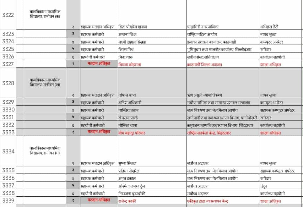 अधिकारीलाई काठमाडौंको वालविकास माध्यमिक विद्यालय रानीवन (ख) मतदान केन्द्रमा खटाइएको छ । त्यहाँ राष्ट्रिरय सर्तकता केन्द्रका शाखा अधिकृत वोमबहादुर परियार मतदान अधिकृतको रुपमा खटिएका छन् । सहायक मतदान अधिकृतमा ऋृण असुली न्यायधीकरणमा कार्यरत नायब सुव्वा गोपाल थापा,सहायक कर्मचारीका रुपमा सामान्य प्रशासन मन्त्रालयका कार्यालय सहयोगी अनिश अधिकारीलाई खटाइएको छ । उनलाई कम्युटर अपरेटरको रुपमा अर्थात एक तह बढुवा गरी निर्वाचनमा सहायक मतदान अधिकृतको रुपमा खटाइएको पाइएको हो । सामान्यका अधिकारीहरुका अनुसार, उनी उनका ठूलो बुवा सामान्य प्रशासनका सह सचिव हुँदा मन्त्रालयमा प्रवेश पाएका थिए । पछि उनको ठूलो बुवा सचिव पदबाटै अवकाश पाइसकेका छन् । तिनै कार्यालय सहयोगी तहका कर्मचारी भन्दा मुनीतिर राखेर सत्य निरुपण तथा मेलमिलाप आयोगका सहायक कम्युटर अपरेटर गान्धिरा प्रधानलाई खटाइएको छ । यस्तै खानेपानी तथा ढल व्यवस्थापन विभागका खेमराज पाण्डेलाई सहायक मतदान अधिकृतको रुपमा खटाइएको छ भने कार्यालय सहयोगीका रुपमा कसुरजन्य सम्पत्ति व्यवस्थापन विभागका कास पदमा कार्यरत मोनिका थापालाई सो मतदान केन्द्रमा खटाइएको छ ।