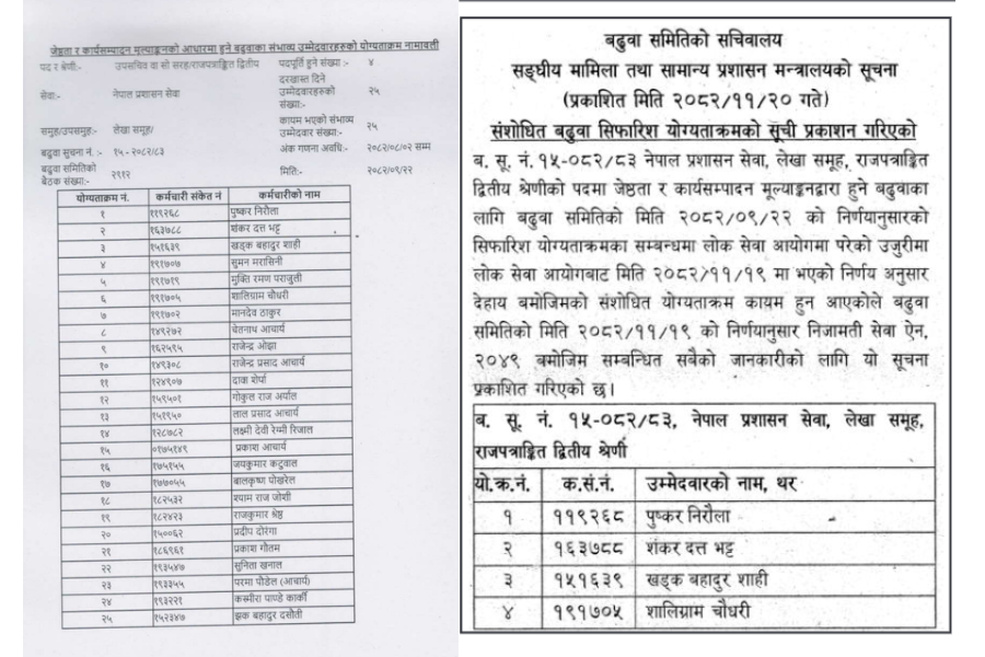 बढुवा सिफारिस समितिको गत पुस २२ को निर्णय अनुसार पदपूर्ति हुने ४ पदमा २५ सम्भाव्य उमेद्धार कायम भएका थिए । जसमा पुष्कर निरौला,शंकर दत्त भट्ट,खड्ग बहादुर शाही,सुमन मरासिनी,मुक्ति रमण पराजुली,शालिग्राम चौधरी,मानदेव ठाकुर,चेतनाथ आचार्य,राजेन्द ओझा,राजेन्द्रप्रसाद आचार्यहरु सम्भाव्य उमेद्धारका रुपमा थिए । समितिले सार्वजनिक गरेको बढुवा सिफारिसविरुद्ध  उपर लोकसेवा आयोगमा उजुरी परेपछि आयोगले दुई महिना पछि आज संशोधित सूची सार्वजनिक गरेको हो ।