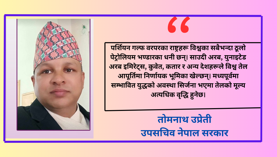 पर्शियन गल्फ वरपरका राष्ट्रहरू विश्वका सबैभन्दा ठूलो पेट्रोलियम भण्डारका धनी छन्। साउदी अरब, युनाइटेड अरब इमिरेट्स, कुवेत, कतार र अन्य देशहरूले विश्व तेल आपूर्तिमा निर्णायक भूमिका खेल्छन्। मध्यपूर्वमा सम्भावित युद्धको अवस्था सिर्जना भएमा तेलको मूल्य अत्यधिक वृद्धि हुनेछ। आपूर्ति श्रृंखला अवरुद्ध हुँदा केवल ऊर्जा क्षेत्रमा मात्र नभई विश्वभरका उद्योग, यातायात र उपभोक्ता क्षेत्रमा प्रभाव पर्नेछ। यसले खाद्यान्न र औषधि वितरणमा समेत संकट गहिर्याउने सम्भावना बढाउँछ।