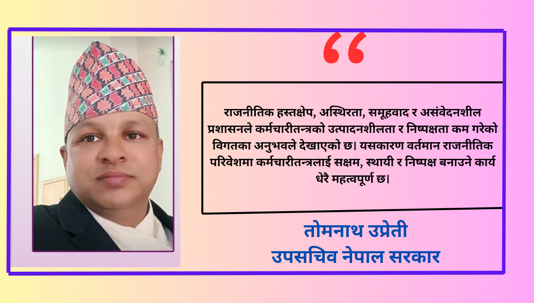 नेपालको कर्मचारीतन्त्र राज्य सञ्चालनको मेरुदण्ड हो, जसले नीति निर्माणदेखि सेवा वितरणसम्मको सम्पूर्ण प्रक्रिया व्यवस्थापन गर्छ। तर विगत केही दशकमा यसमा राजनीतिक हस्तक्षेपले जरो गाडेको देखिन्छ। राजनीतिक दल र कार्यकारीले आफ्नो प्राथमिकता अनुसार कर्मचारी परिचालन गर्दा, पेशागत स्वतन्त्रता र निष्पक्षता कमजोर बन्दै गएको छ। परिणामस्वरूप, कर्मचारीहरू आफ्नो क्षमता अनुसार कार्य गर्न असक्षम बन्छन्, ढिलासुस्ती बढ्छ र जनताको अपेक्षासँग मेल नखाने निर्णयहरू जन्मिन्छन्। यस्तो अवस्था दीर्घकालीन विकास र सुशासनका लागि चुनौतीपूर्ण छ।