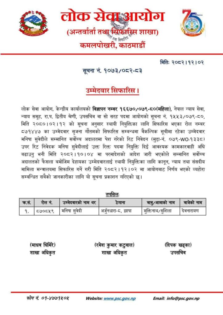 लोकसेवा आयोग केन्द्रीय कार्यालयको विज्ञापन नम्बर १६६७०/ ०७९- ८० (महिला)तर्फ न्याय सेवा,न्याय समूह,राजपत्राकिंत द्धितीय श्रेणी वा सो सरहको पदमा आयोगको सूचना १५५३/ ०७९- ८० मिति ८० जेठ १२ को सूचना अनुसार स्थायी नियुक्तिका लागि सिफारिस भएकी थिइन ८७१४४७ रोल नम्बरकी उमेद्धार सृजना गौतम । सिर्जना खुलामा पास हुँदा मनीषाको नाम वैकल्पिकमा निस्किएको थियो। सोही विरुद्ध सिर्जनाले फेक डकुमेण्टको आधारमा आवेदन दिएको भन्दै मनीषाले लोकसेवामा उजुर हालिन् । तर, लोकसेवाले यसउपर कुनै कारबाही गरेन । र, उनी सर्वोच्च पुगिन । २०८० जेठ १६ गते दर्ता भएको उनको मुद्दा नम्बर ०७९–डब्ल्युओ–१३३८ रहेको छ । १६ पटक पेशी चढेको र झण्डै तीन वर्ष चलेको मुद्दामा माघ ४ गते आइतबार अदालतले परमादेश जारी गरेको छ,मनिषाको पक्षमा ।
