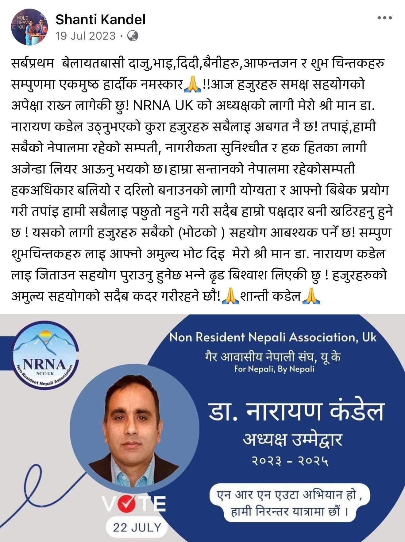 यो टिप्पणीसँगै सामाजिक सञ्जालमा कँडेलकी पत्नी शान्ति कँडेलले यसअघि गरेको एक पोस्ट पनि चर्चामा आएको छ। उक्त पोस्टमा उनले गैरआवासीय नेपाली संघ (NRNA) यूकेको अध्यक्ष पदमा आफ्नो श्रीमान् उम्मेदवार बन्न लागेको उल्लेख गर्दै बेलायतमा रहेका नेपालीहरूलाई समर्थन र भोट मागेकी थिइन्। पोस्टमा नेपालमा रहेको सम्पत्ति र नागरिकता अधिकार सुनिश्चित गर्न अभियान चलाउने अजेन्डासहित समर्थन मागिएको थियो।