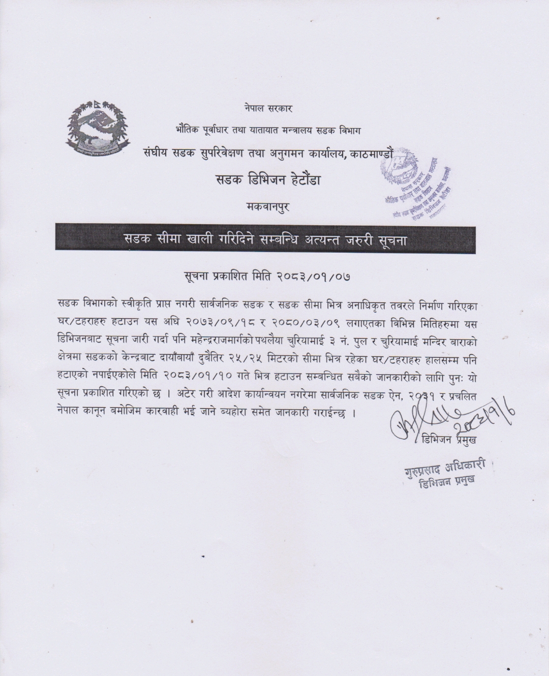 सडक डिभिजन कार्यालय हेटौंडाले महेन्द्रराजमार्ग अन्तर्गत पथलैया–चुरियामाई क्षेत्रको सडक सीमाभित्र रहेका अनाधिकृत घरटहरा हटाउन अत्यन्त जरुरी सूचना जारी गरेको छ।
