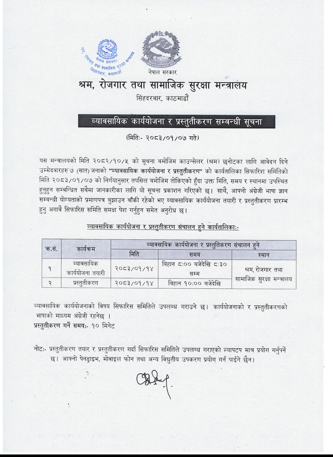 सूचना अनुसार १४ गते अन्तर्वार्तासहित प्रस्तुतीकरण कार्यक्रम राखिएको छ। मन्त्रालय स्रोतका अनुसार बरन्डामा लामो समयदेखि ‘कुर्न’ राखिएका आठ जनामध्ये पाँच जनाको यसअघि नै अन्यत्र पोस्टिङ भइसकेको छ।