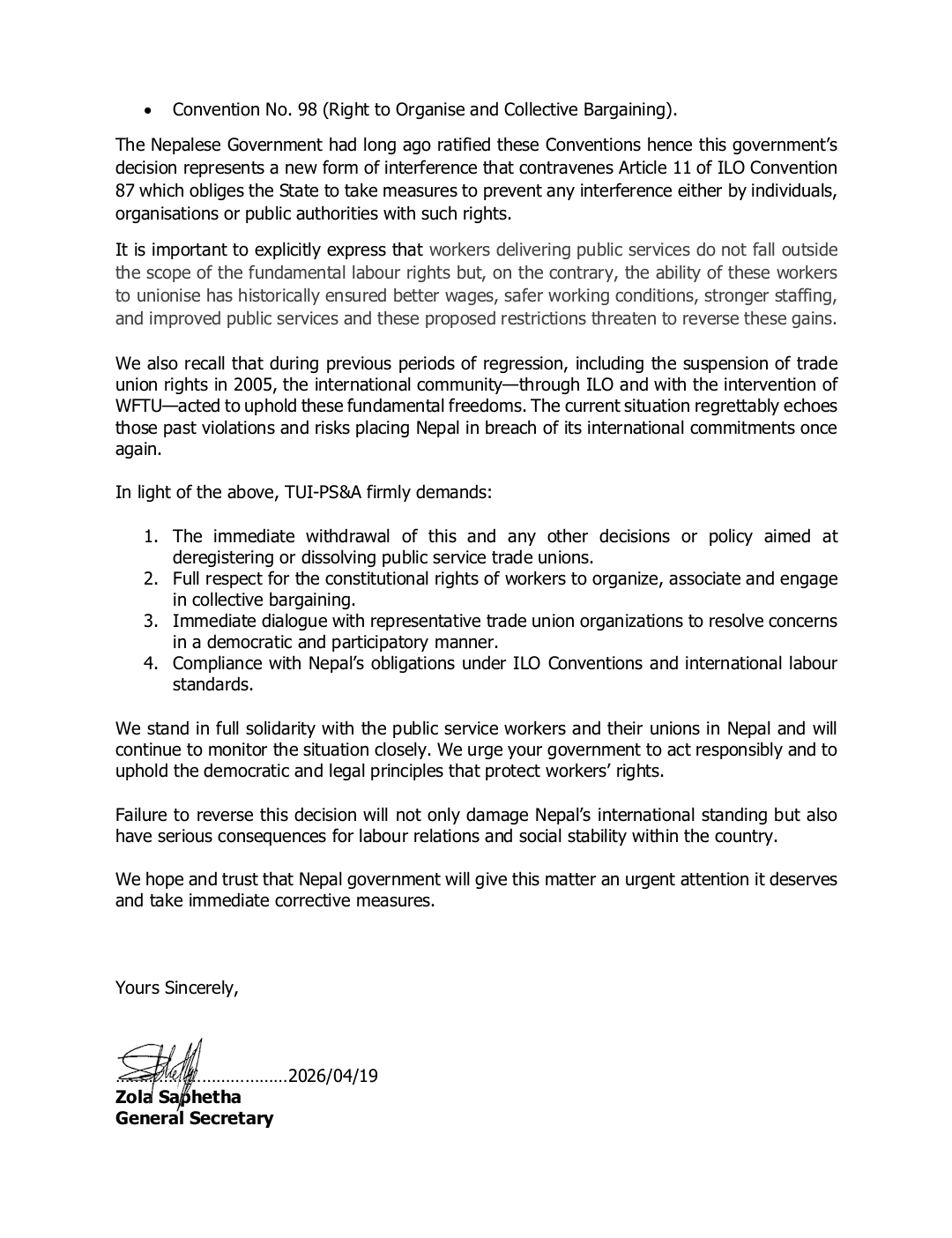 पत्रमा सार्वजनिक सेवा क्षेत्रमा कार्यरत श्रमिकहरू तथा उनीहरूका प्रतिनिधि संस्थासँग ऐक्यबद्धता प्रकट गर्दै यस विषयलाई अन्तर्राष्ट्रिय स्तरबाट निरन्तर अनुगमन गरिने पनि जनाइएको छ। साथै निर्णय पुनर्विचार नगरे नेपालका श्रम सम्बन्ध, सामाजिक स्थायित्व तथा अन्तर्राष्ट्रिय छविमा दीर्घकालीन नकारात्मक असर पर्न सक्ने चेतावनीसमेत दिइएको छ।