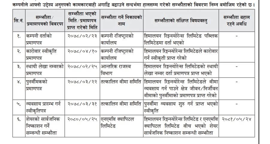 हिमालयन रिइन्स्योरेन्स कम्पनी २०७८ साल जेठ महिनामा तत्कालीन बीमा समितिबाट अनुमति प्राप्त गरी स्थापना भएको थियो। उक्त कम्पनीले अनुमति प्राप्त गर्ने प्रक्रिया नै सुरुदेखि विवादित रहेको आरोप विभिन्न वृत्तबाट उठ्दै आएको छ। बीमा क्षेत्रका केही जानकारहरूले त्यसबेला कम्पनीलाई दिइएको अनुमति अपारदर्शी ढंगले भएको भन्दै प्रश्न उठाएका थिए।