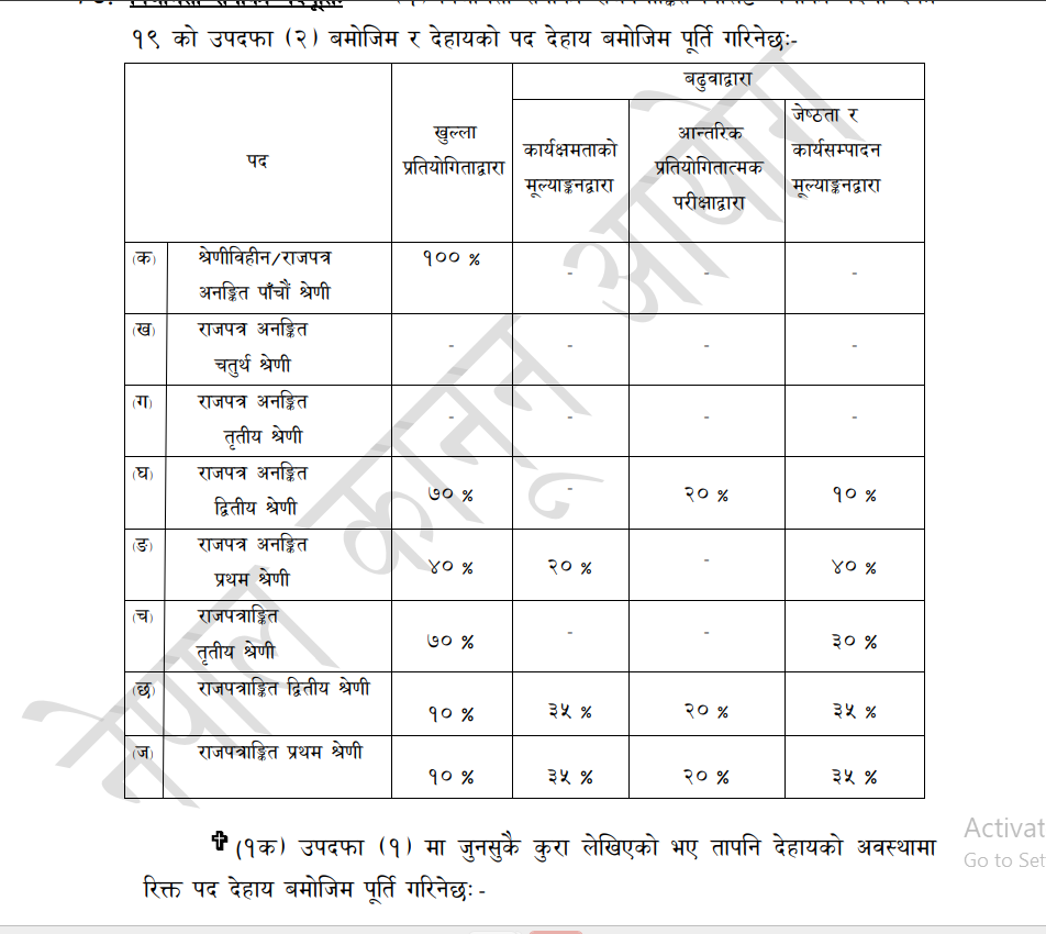 विद्येयकको मस्यौदामा राजपत्रअनंकित प्रथम श्रेणी सहायक पाँचौं तहको हकमा खुला प्रतिष्प्रर्धाबाट १० प्रतिशत,अन्तरतह प्रतिष्प्रर्धाबाट १० र बढुवाबाट ८० प्रतिशत पूर्ति गर्ने प्रस्ताव राखिएको छ । यस्तै,रापत्रांकित तृतीय श्रेणी (शाखा अधिकृत) अन्तर सेवा १० प्रतिशत, ज्येष्ठता र कार्य सम्पादन मूल्याङ्कन २० प्रतिशत, ७० प्रतिशत खुल्लाबाट पदपूर्ति गरिने छ ।